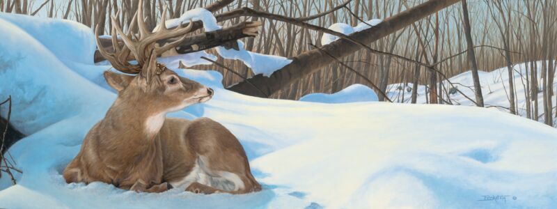"Northern Elder" depicts a majestic stag standing tall amidst a serene winter...