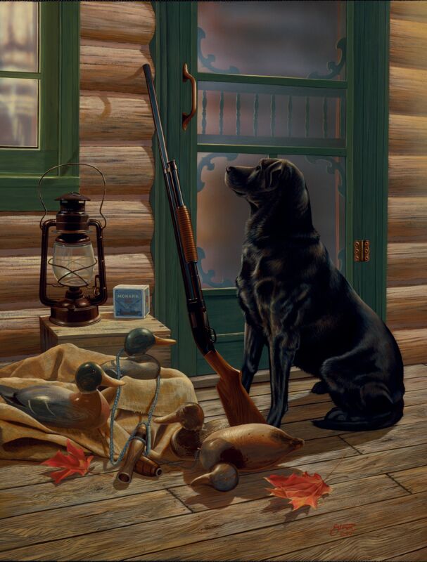 A Chocolate Lab sitting at a cabin door, waiting for his master...