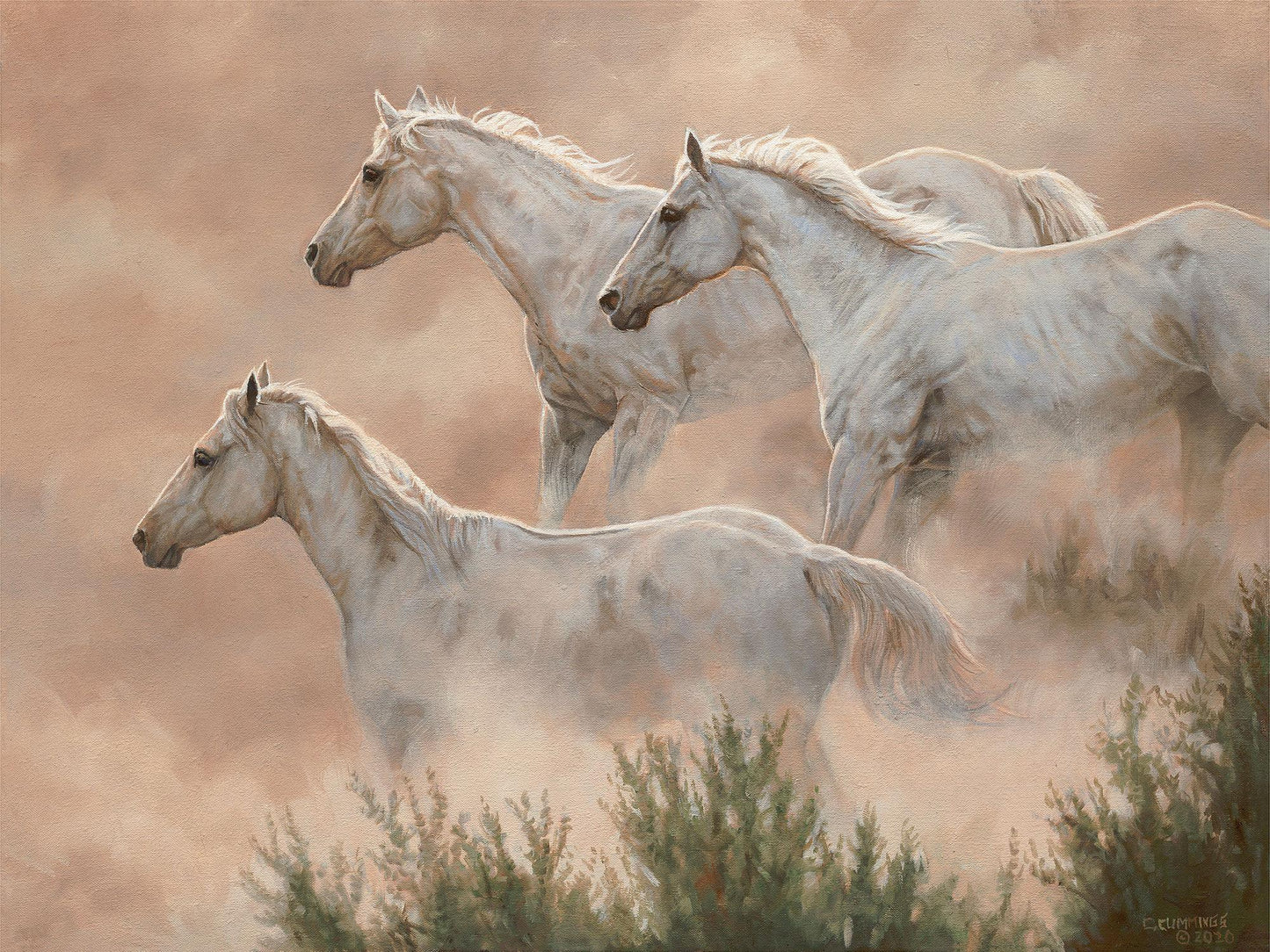 During a roundup on a ranch in E. Oregon, the dust from many horses' hooves rose up around these horses' legs as they descended a hillside, making it appear as if they were floating in the clouds of dust.