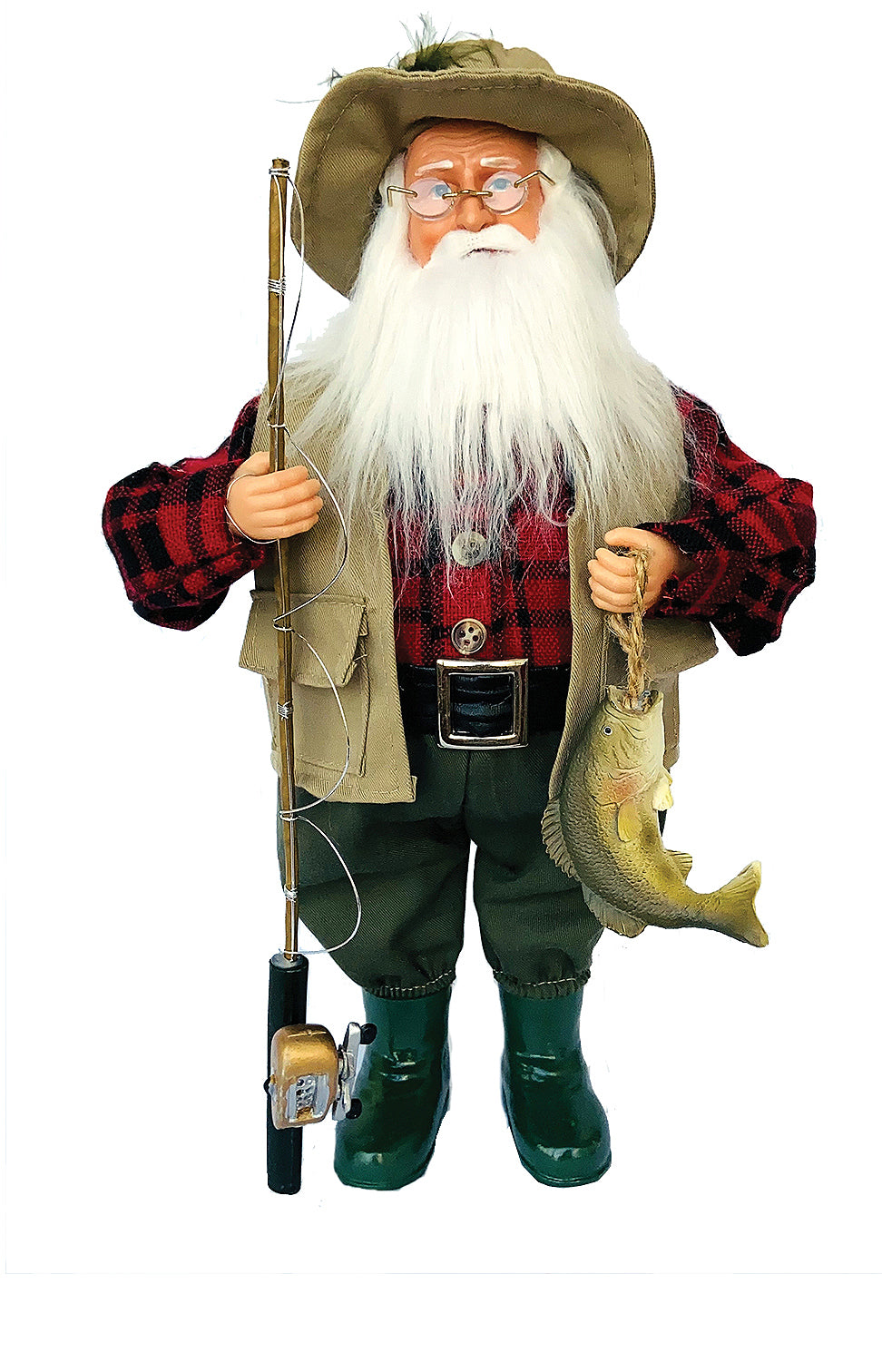 Occasionally, Santa likes to escape the frozen North and head to warmer climates and free flowing rivers, where he slips on his favorite waders and tries to catch a big one! The detail and craftmanship of this wonderful 15" Bass Fishing Claus figurine will bring fun and delight for many seasons to come.
