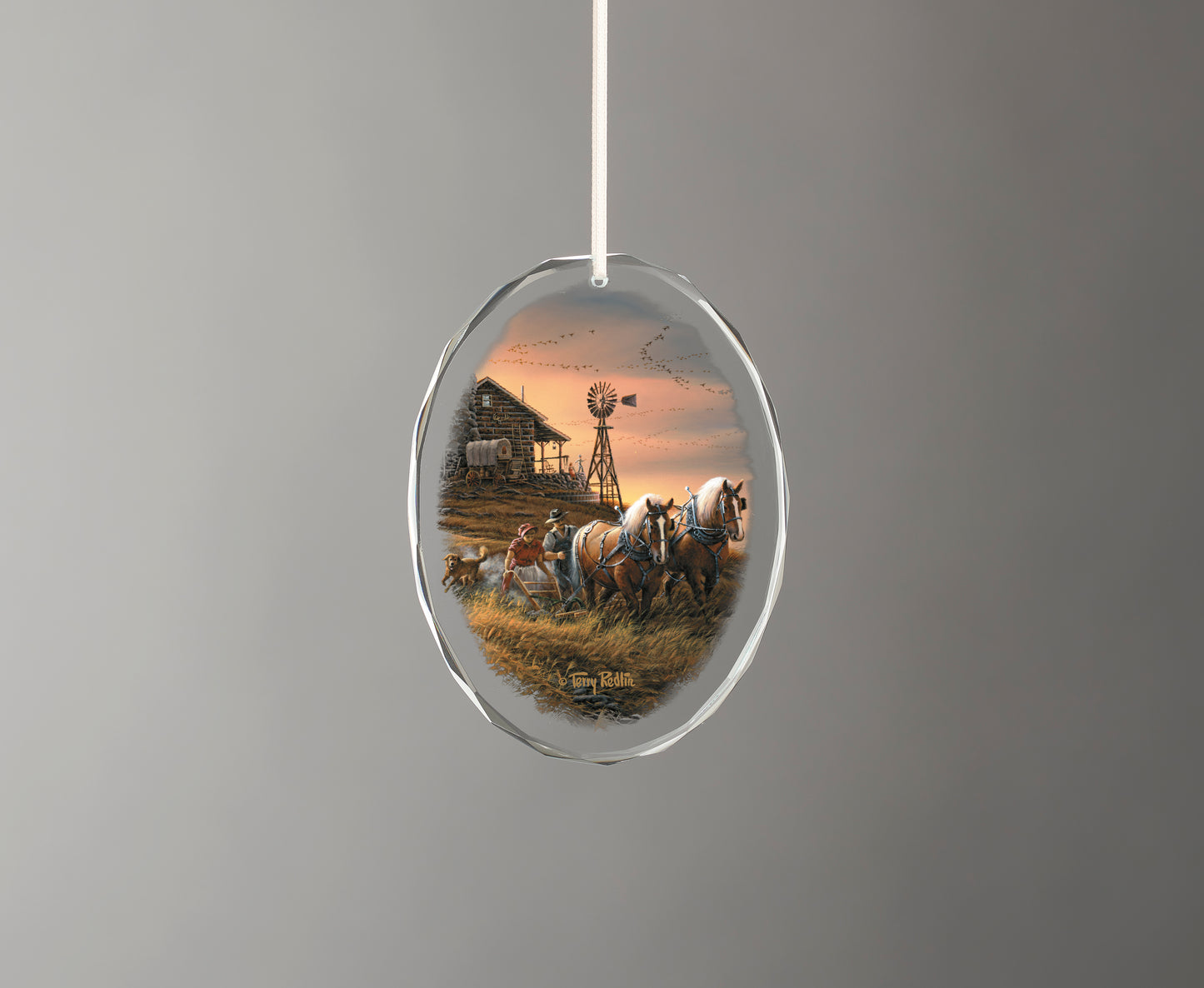 Oval, beveled-cut glass ornaments feature images from your favorite artists. Includes 10" silver ribbon for hanging and black velvet bag for storage. Produced by Wild Wings; a division of Art Brand Studios. Designed and printed in North America. 3-1/2"H x 3"W
