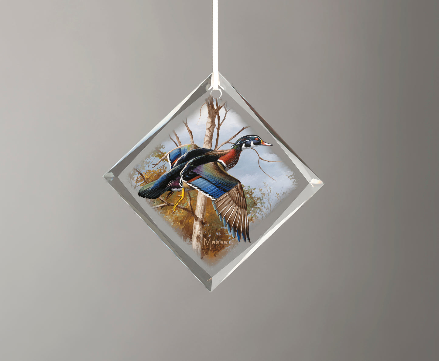 Diamond-shaped, beveled-cut glass ornaments feature images from your favorite artists. Includes 12" silver ribbon for hanging and black velvet bag for storage. Produced by Wild Wings; a division of Art Brand Studios. Designed and printed in North America. 4-1/2"H x 4-1/2"W