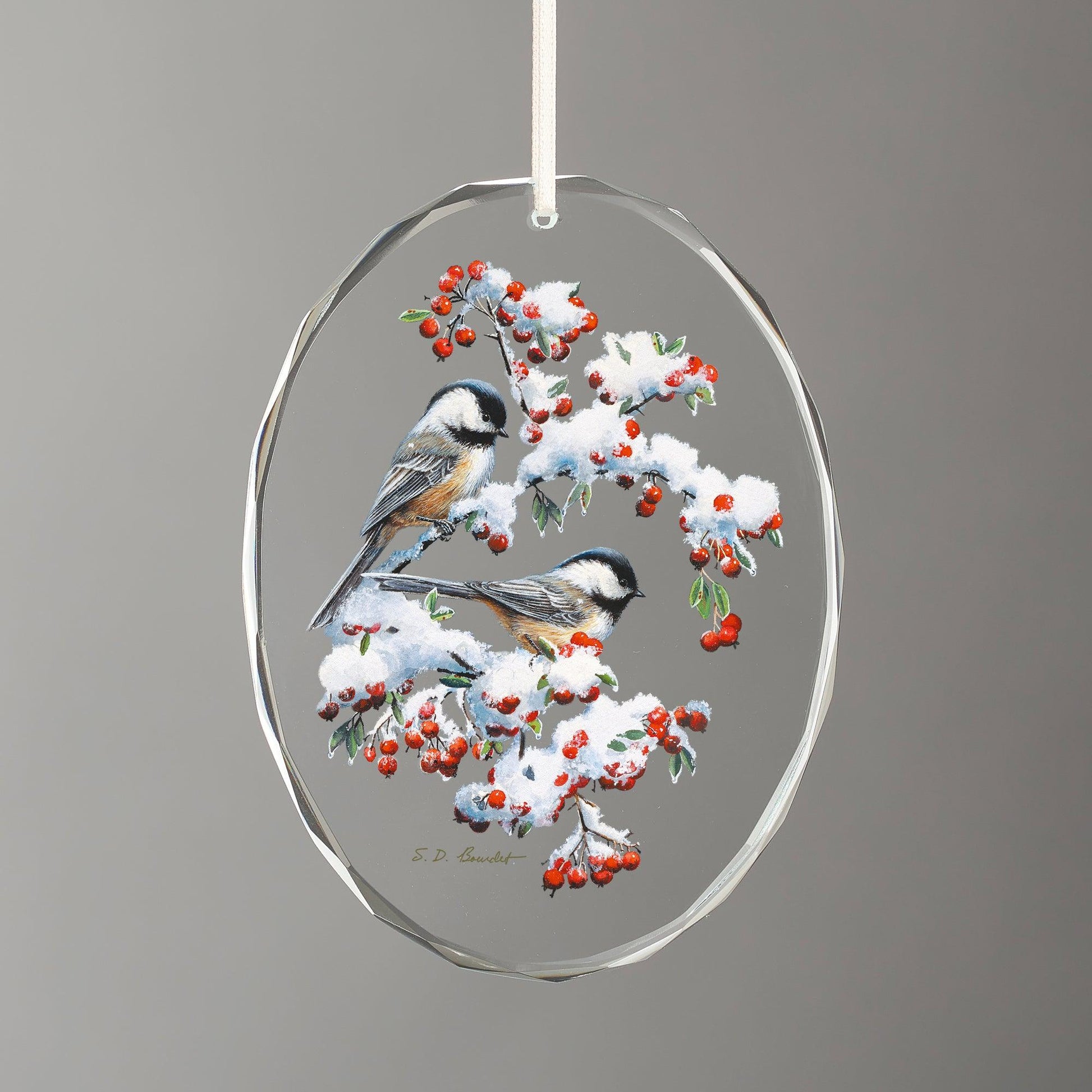 Oval, beveled-cut glass ornaments feature images from your favorite Wild Wings artists. Includes 10" silver ribbon for hanging and black velvet bag for storage. Made exclusively by Wild Wings. 3" x 3-1/2".