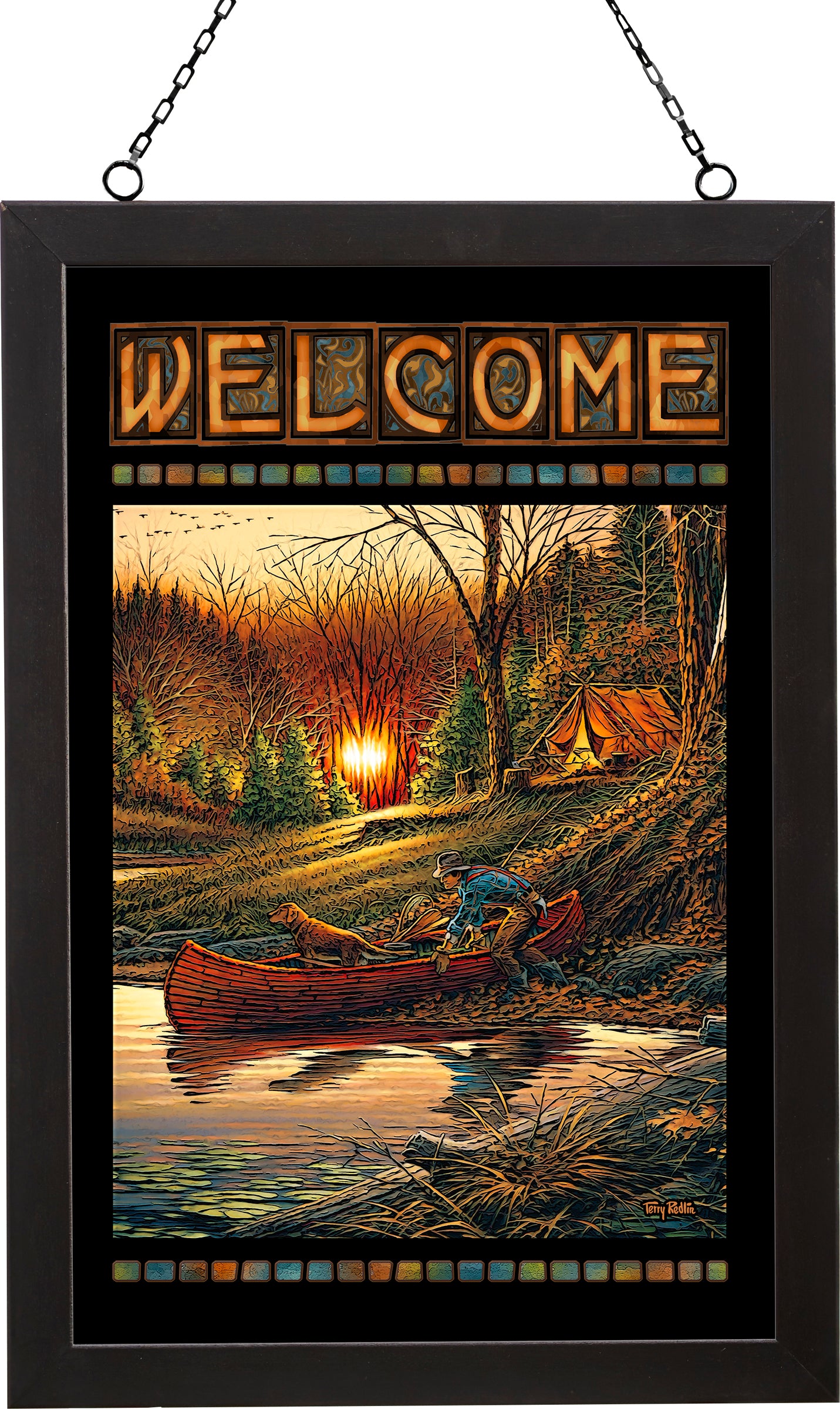 Let the light shine! New stained glass art hangings show their true colors when backlit with natural sunlight. Popular designs are printed with fade resistant inks on 18"H x 12"W glass, framed with 1" black-finished moulding. Framed size 20"H x 14"W. Ready to hang with provided chain. Printed, designed and assembled in North America.