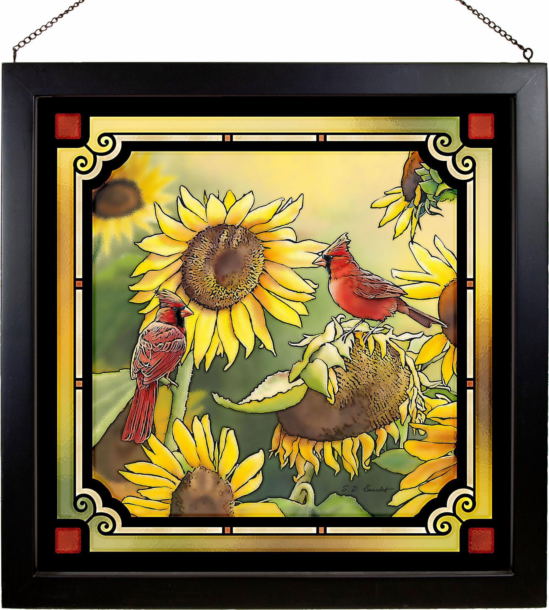 Let the light shine! New stained glass art hangings show their true colors when back-lit with natural sunlight. Popular designs are printed on glass with fade resistant inks and framed with 1" black-finished moulding. Framed size 20" x 20". Ready to hang with provided chain. Designed, printed, and assembled in USA.