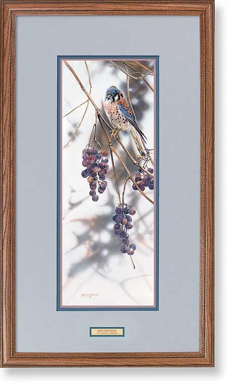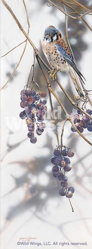 I watched a kestrel terrorize waxwings in grapevines one day. The waxwings were there to eat grapes; the kestrel there with 'Grape Expectations. ' I painted him with a kind of exhausted stare - he chased those birds all day. I never saw him get one.