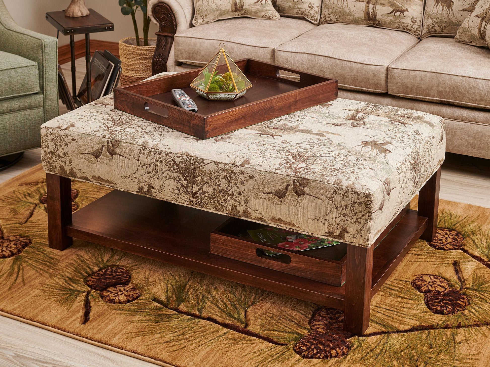 Radiating heirloom quality, the allure of this collection is all in the details! For starters, this stunning bench is made to order and handcrafted in the USA. Wrapped in an earthy neutral pallet of creamy stucco and mineral gray brown settles handsomely into any decor. The nature-themed tapestry and chenille fabric features a harmonious scene of whitetail deer, pheasant and fox sharing the same forest as they meander across. Bench comes with two versatile, dark-stained wood trays. Bench fabric is 100% Polyester. Fabric swatches available. Allow 3 to 6 weeks for delivery. 20"H x 49"W x 33"D