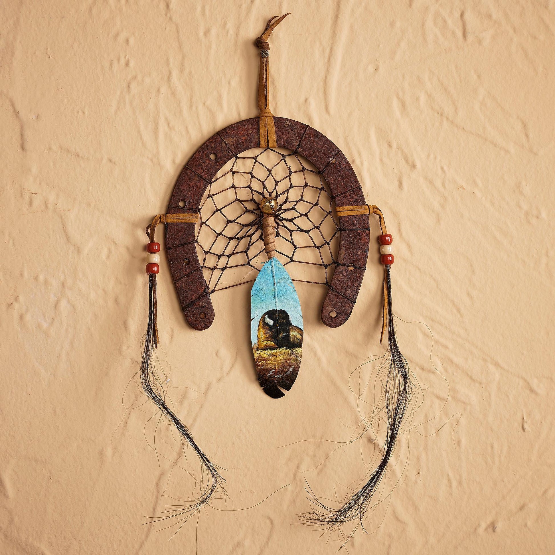 Double the good fortune! Luck spills forth from the metal horseshoe while any negative energy is entangled in the sinew webbing of the dreamcatcher. Only positive energy and good fortune come forth in these beautiful works of art. Accented with beads, leather cords, and horsehair, a hand painted domestic feather by a member of a Native American tribe, anchors the ensemble. 12"H x 6¼"W