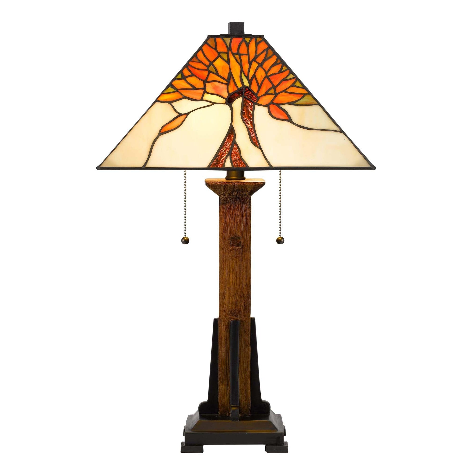 Reflect on the splendor of autumn with the vibrant reds, orange, and yellow tones in this Missionstyle table lamp. The intricately hand-cut art glass shade is artfully supported with a durable faux wood base. Pull chain sockets require two, 60-watt bulbs, not included. UL listed. 23"H x 14" x 14".