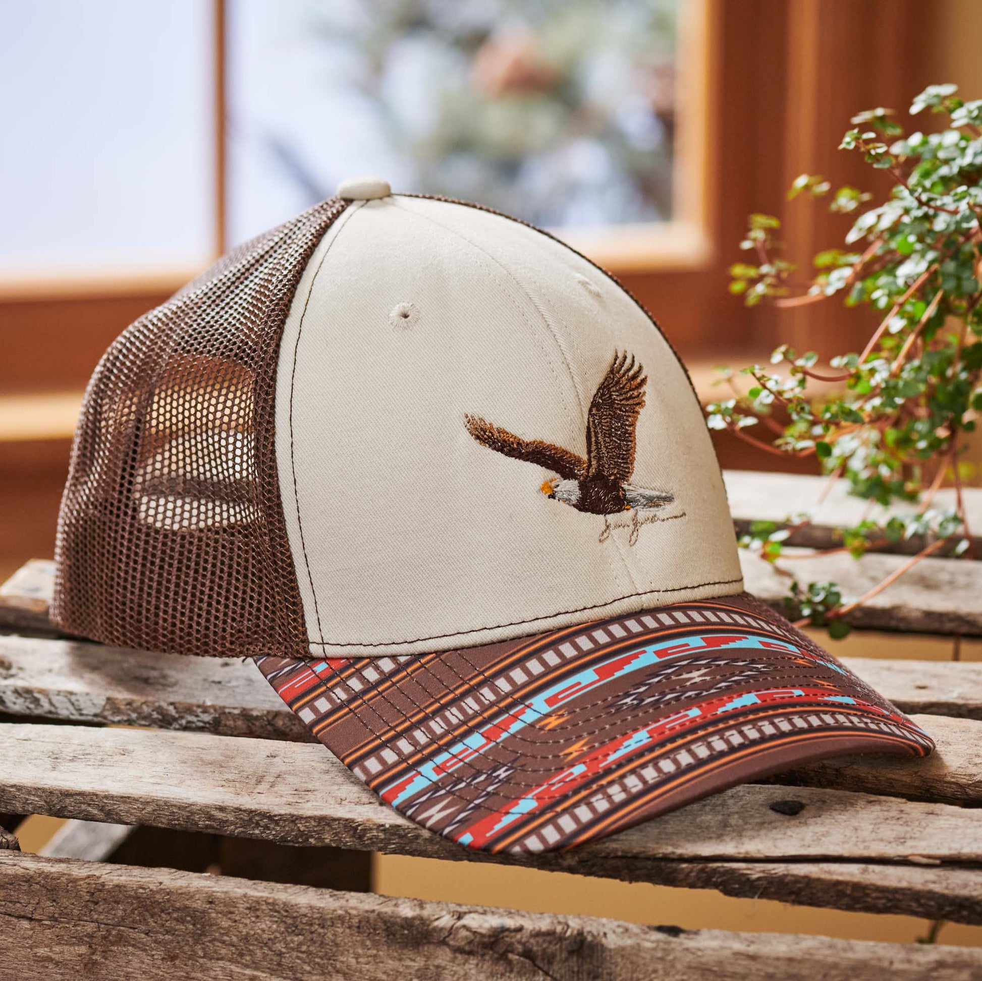 Freedom and grace accompany an eagle in flight on this contrasting trucker-style hat. Stone colored-chino twill front panels transition into contrasting dark brown mesh back. Lid boasts a multicolored, Southwest geometric pattern. Snap back closure and comfort sweatband. Hand wash. Personalization available. Specify up to 10 characters. Embroidered eagle artwork “Freedom Glow-Bald Eagle” © Janene Grende.