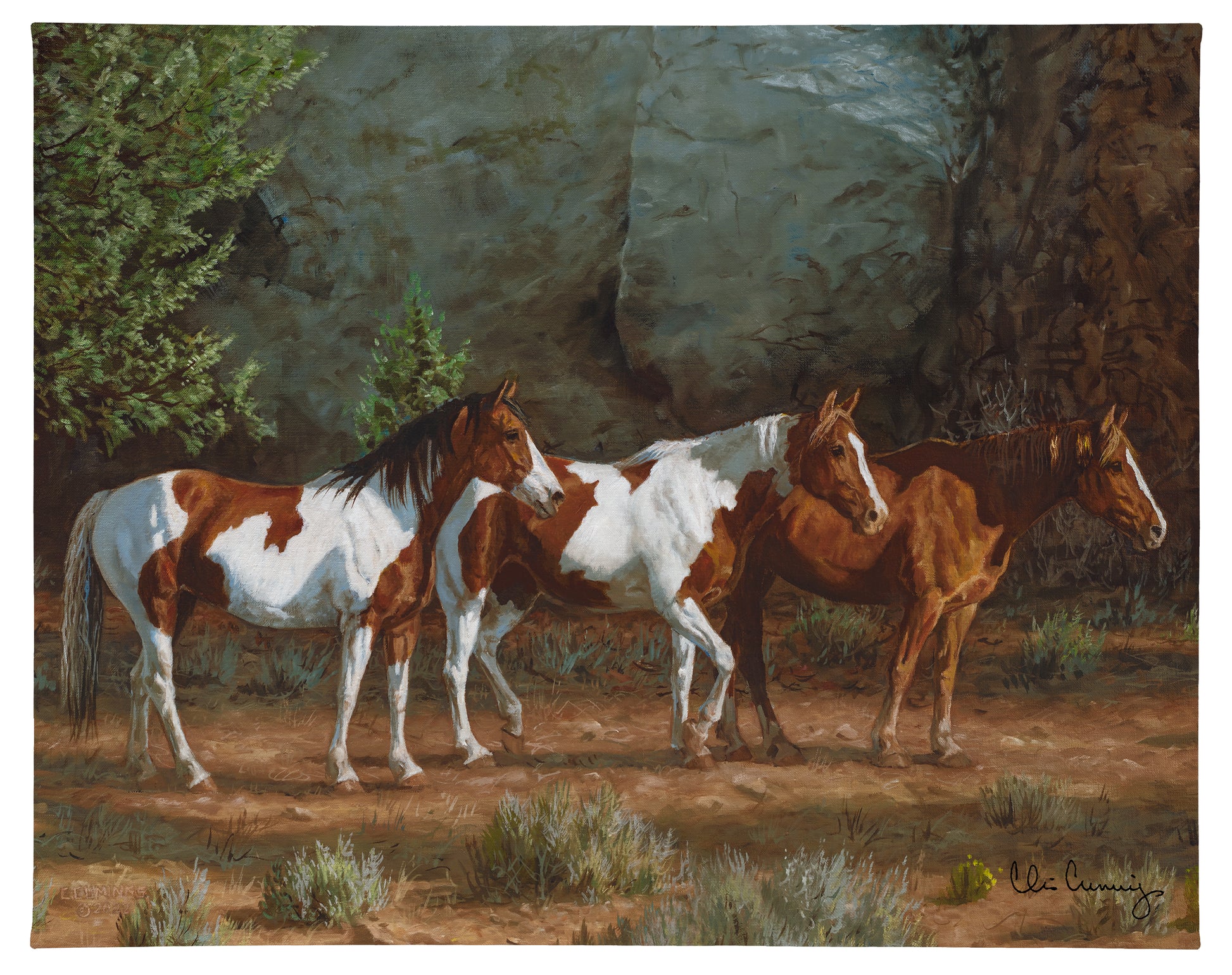 The morning light casts long shadows across the canyon floor, where three horses are caught in the sunlight, resting while paying close attention to the rest of the herd's activities.About the Product
