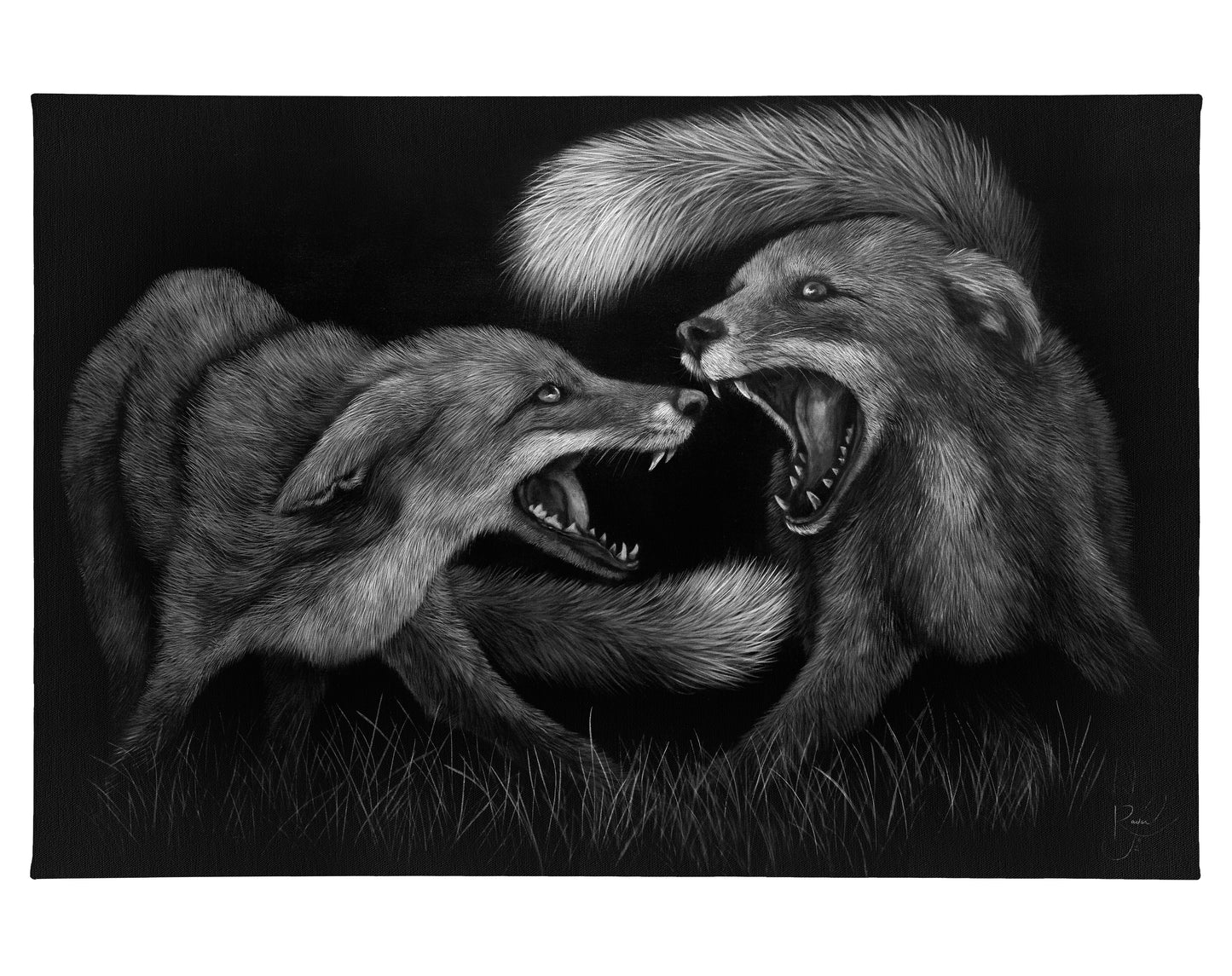 Red foxes typically live in family groups, however, they typically split in two categories: subordinate or dominant. I wanted to depict their potentially aggressive nature for this painting.About the Product