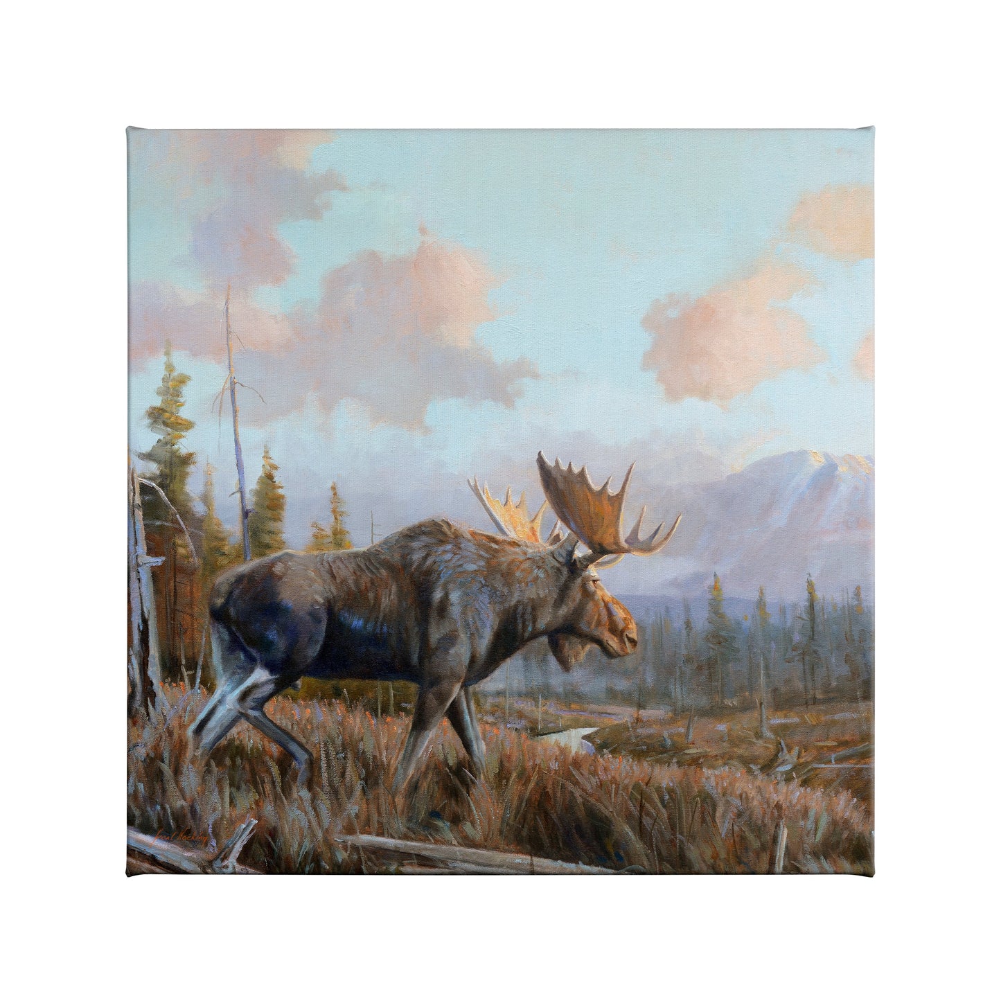 Creating this painting brought me immense joy. Living in New England, we have a significant population of moose. Unfortunately, they are not easy to spot due to the dense forest that envelops the region, keeping them hidden for the most part. I was eager to paint a moose, so I embarked on an early morning expedition with a group of photographers who claimed to know the exact location where we could find one. After hours of driving, we arrived at the promised spot just as the sun was rising. With my camera at the ready, I eagerly awaited the call for the moose. However, as time passed, excitement transformed into sheer boredom, and not a single moose came into view. I painted this moose based on the image I had conjured in my mind.About the Product