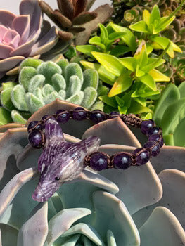 A powerful spirit animal hand carved from natural gemstones. Adjustable slipknot clasp fits everyone. Unisex design. No metals to aggravate allergies. Due to the the use of natural gemstones, the actual item you receive may differ slightly from what is pictured but it will be equally fabulous. Provides comfort and strength to those who selflessly give of themselves. It alleviates sadness and grief, and dissolves negativity. It has strong healing and cleansing powers. Amethyst encourages sobriety and helps those struggling with addiction. Encourages selflessness and spiritual wisdom.