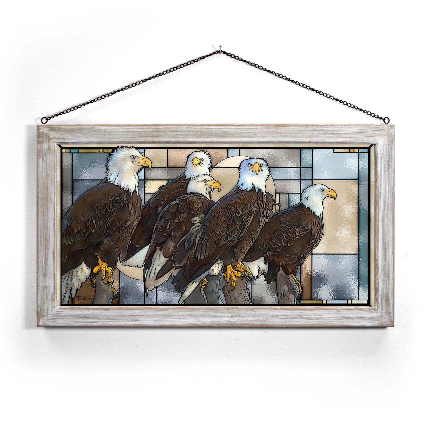 Let the light shine! Stained glass art hangings show their true colors when back-lit with natural sunlight. Popular designs are printed with fade resistant inks on 11" x 21" glass, framed with 1" white-finished moulding. Framed size 13" x 23". Ready to hang with provided chain. Designed, printed, and assembled in USA.
