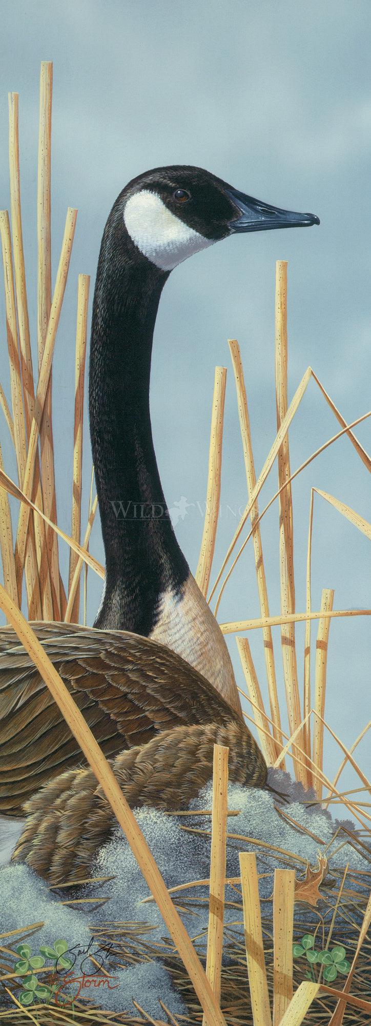 Signature edition art print made from the original acrylic painting depicting a strongly vertical, closeup portrait of a mother Canada goose sitting on her nest among tall reeds. Image size, 7" x 19".