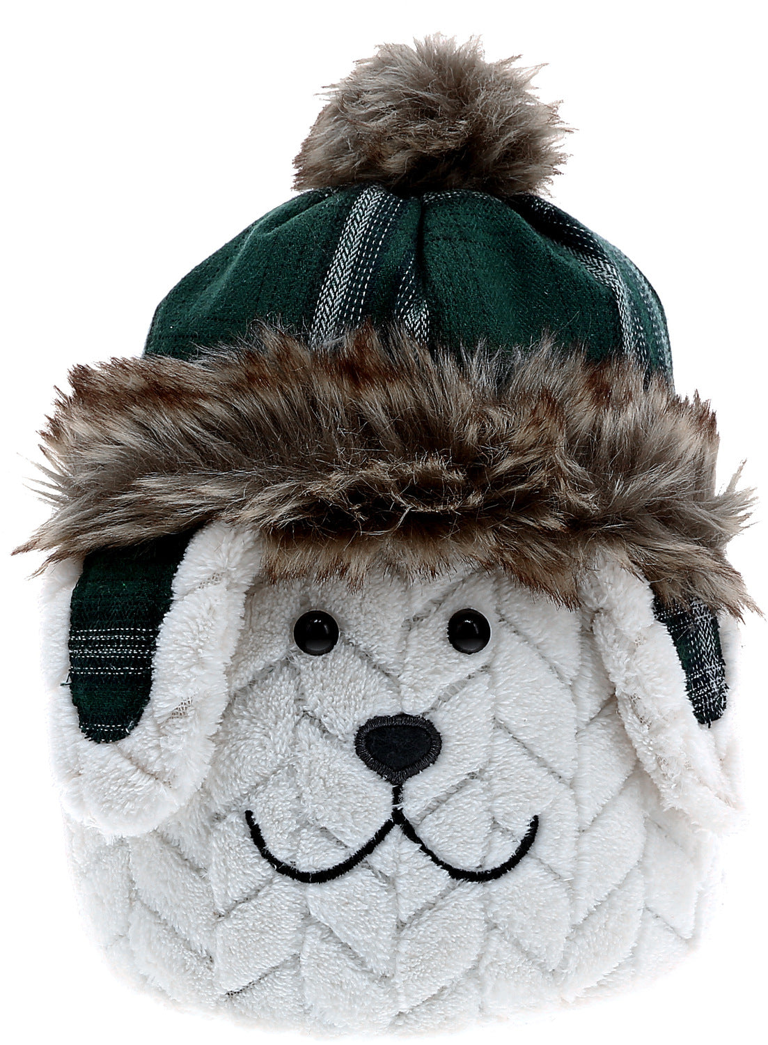 The dog has a black embroidered face, a felt gray nose, and plastic black and gray eyes. The fluffy brown fur-trimmed winter hat sits on the dog's head. Meanwhile, the green plaid details and debossed white chevron patterns are made from 100% polyester. The interior has fluffing, weighted beads, and a felt bottom to protect floors and hardwood surfaces. This holiday winter-centric piece will brighten Christmas spirits with its happy, smiling face. It's packaged in a plastic polybag with a hang tag. The sewn-in logo tag is placed on the backside of the stack. Weighing approximately 2 pounds, this door stopper can hold open lightweight wooden doors; it is not meant for holding open spring-loaded or heavyweight doors. . Spot clean only. Sundry. Keep out of reach of children and pets. Wonderful for pet parents of a snuggly K9 puppy doggy dog adopted friend. Dog moms/dads will be excited to display this winter wonderland item throughout the season.