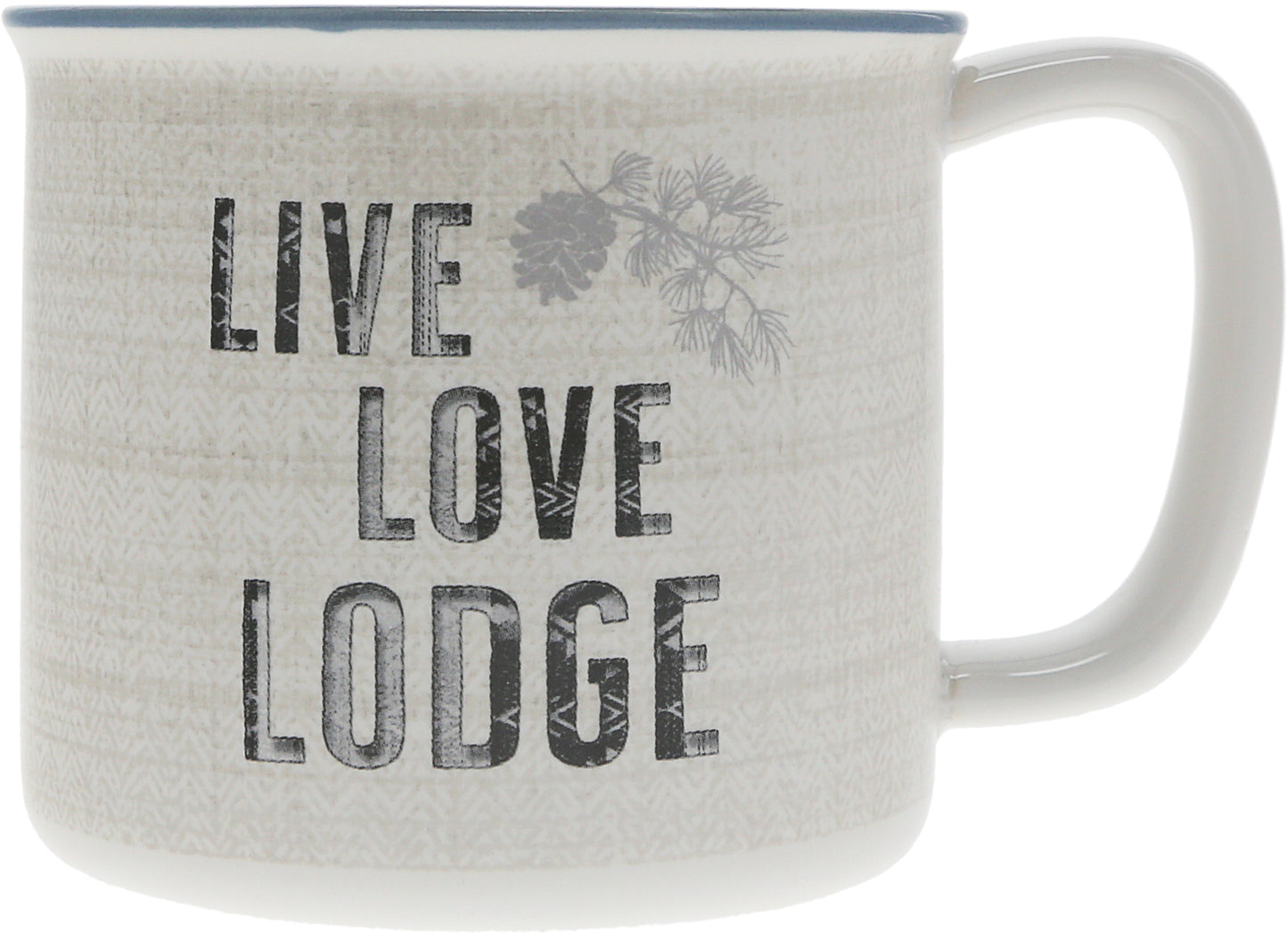 17 oz stoneware coffee cup mug measures 5.5" long x 4" wide x 4.75" tall. Large easy-to-hold rounded edge handle - flat top and bottom for comfortable thumb resting—glossy finished interior & exterior. Tapered easy-to-sip lip construct with straight-edged sides. Cream body with a faded beige chevron design wraps around the vessel's entirety. In contrast, the front side has a light gray silhouette of a pine cone and branch accompanied by a "Live Love Lodge" ikat/Navajo patterned sentiment. The handle is a solid white, and the interior is soft blue. Dishwasher & microwave safe. They are packaged securely in a die-cut box for safe shipping. These rustic lodge-themed cool-toned patterns complement the decor of any woodsy cabin kitchen or dining room. Memories at the lodge are immaculate, including activities of hiking, canoeing, kayaking, fishing, biking, or snuggling up by the fire with loved ones.