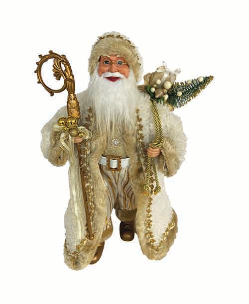 Toss out that old red suit because Santa is taking it up a notch! Santa's new look features a plush, gold-trimmed coat and hat with complementary shiny gold boots. He carries a gold staff in one hand and some stylish presents and holiday decorations in the other. With head, hands and boots molded from sturdy resin, this wonderful 18" Victorian Claus will bring fun and delight for many seasons to come.