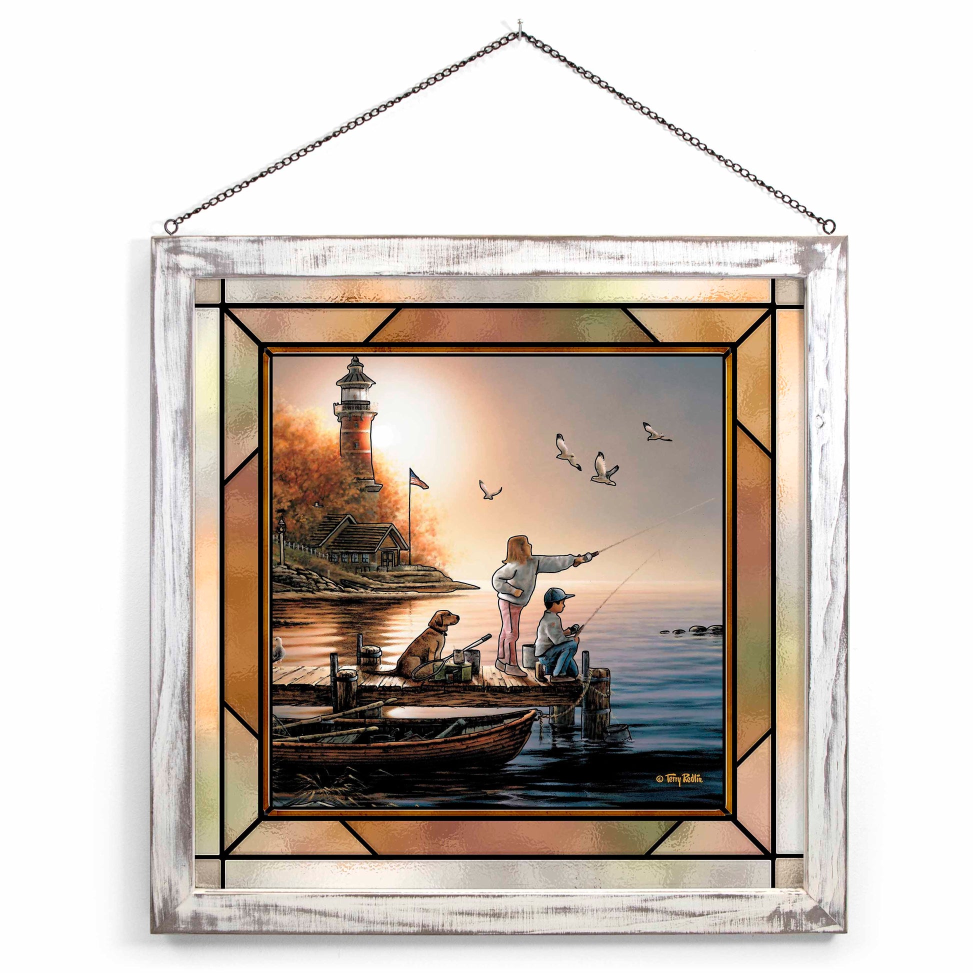 Let the light shine! New stained glass art hangings show their true colors when back-lit with natural sunlight. Popular designs are printed on glass with fade resistant inks and framed with 1" white-finished moulding. Framed size 20" x 20". Ready to hang with provided chain. Designed, printed, and assembled in North America.