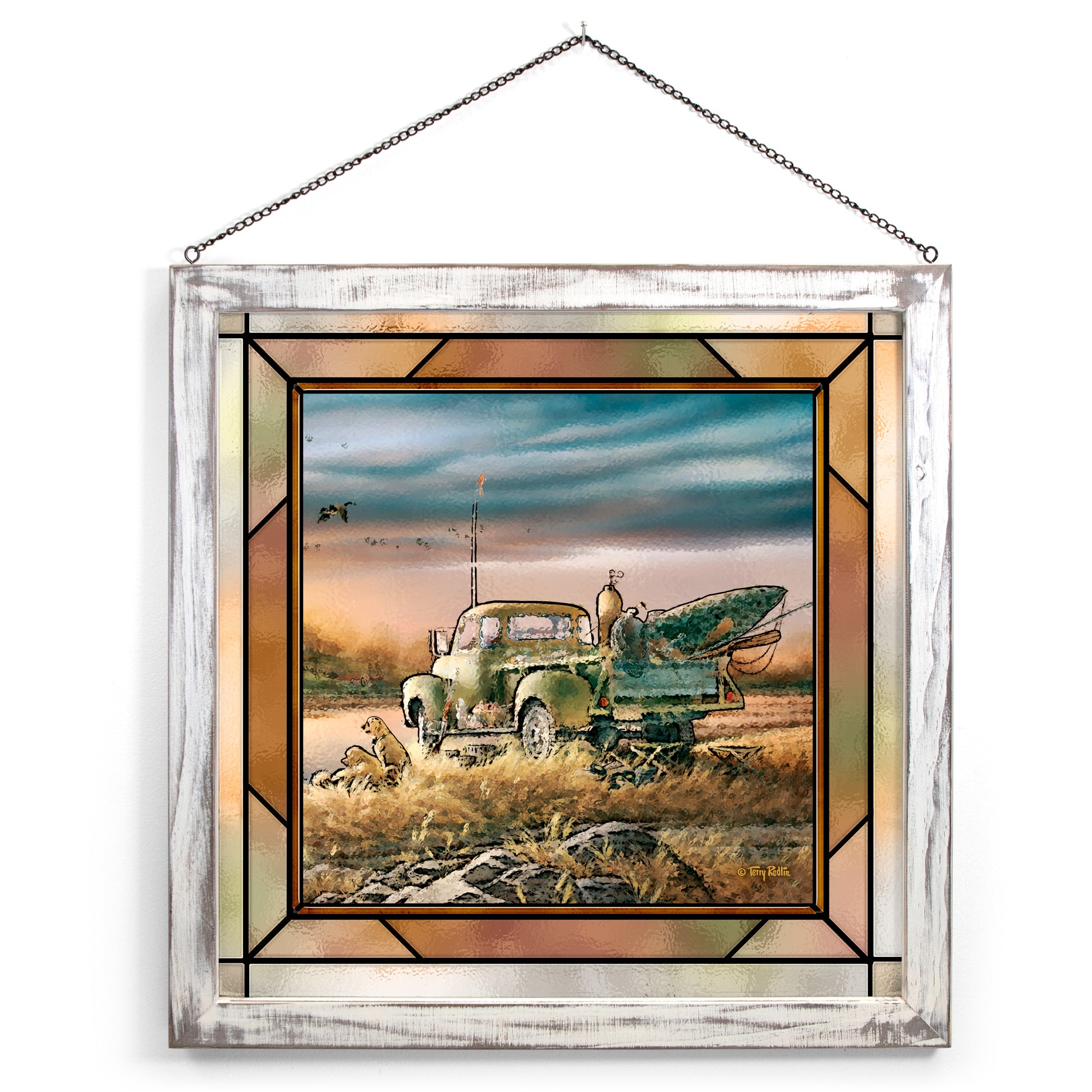 Let the light shine! New stained glass art hangings show their true colors when back-lit with natural sunlight. Popular designs are printed on glass with fade resistant inks and framed with 1" white-finished moulding. Framed size 20" x 20". Ready to hang with provided chain. Designed, printed, and assembled in North America.