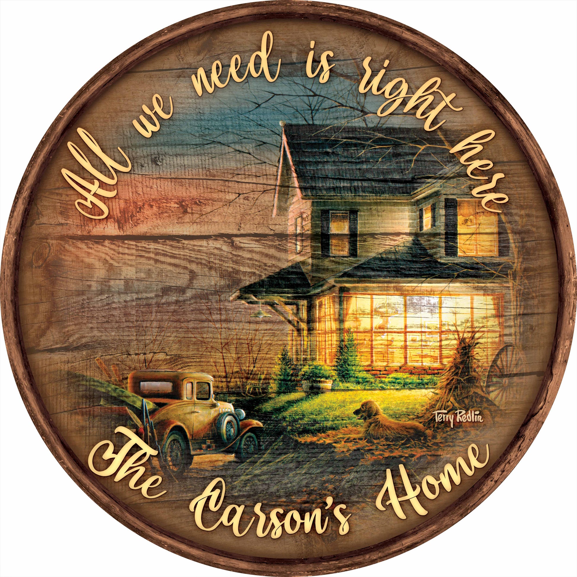 These rustic round wood signs give encouragement or warm heart-felt sentiments with a shabby-chic style. Ready to hang with key hole hanger in back. 21" dia. x 3/8"D. Black-finished edge. Display indoors only. Designed and printed in the USA. Produced exclusively by Wild Wings.