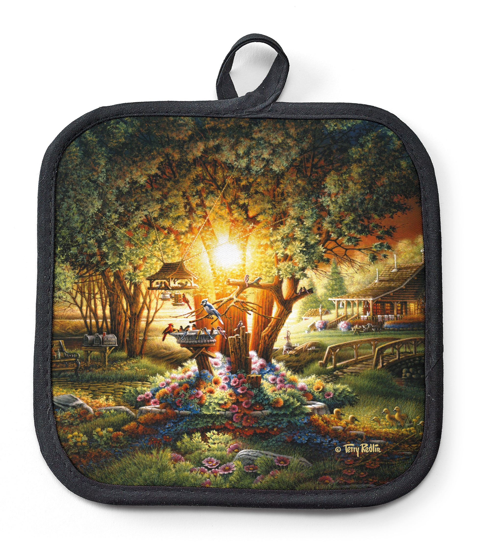 Mix in a dash of nature with our kitchen essentials. Beautiful wildlife images and scenes are printed, and heat cured for bold, high quality, and long-lasting wear. Black accent piping. Quilted backing. 50/50 cotton/poly blend. Machine washable. Designed and printed in the USA. 8" square.
