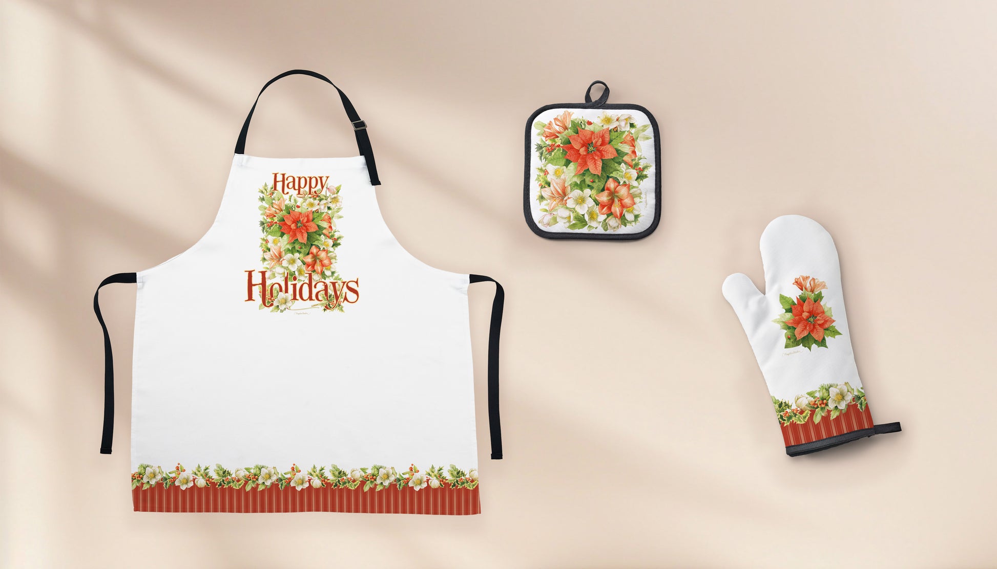 Celebrate the holiday season in style with The Holiday Blooms Collection, a beautifully designed kitchen set featuring Marjolein Bastin artwork. The collection includes an apron, pot holder, and oven glove. Adorned with vibrant poinsettias and delicate seasonal florals, this set brings warmth and cheer to your cooking and baking traditions.