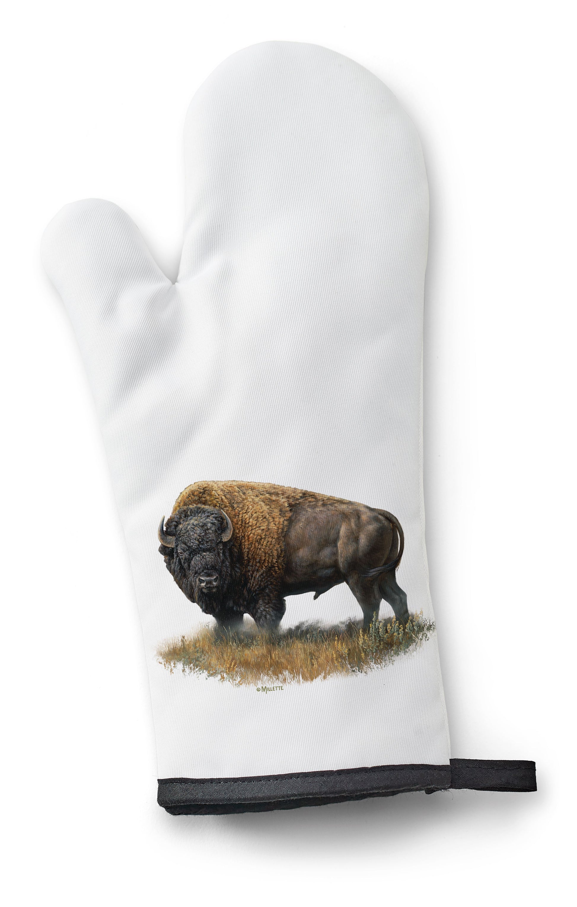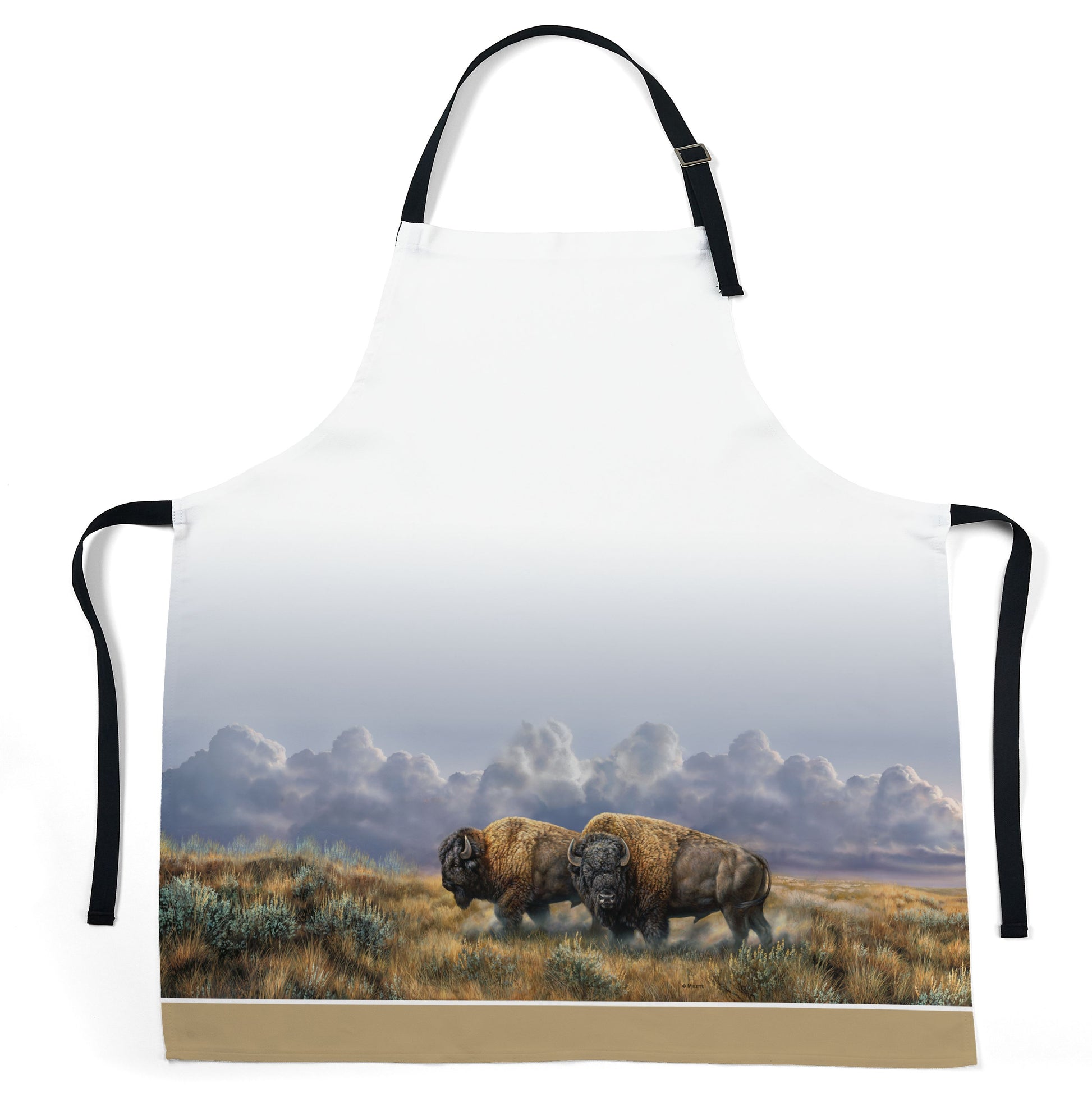 Bring the spirit of the wild frontier into your kitchen with The Dusty Plains - Bison Collection. Featuring the artwork of Rosemary Millette. The collection includes an apron, pot holder, and oven glove with a breathtaking artwork of majestic bison roaming the open plains. This beautifully crafted set is perfect for those who appreciate rustic charm and nature-inspired design. Whether you're grilling outdoors or cooking up a feast in the kitchen, this set offers both practicality and a bold statement of Western heritage.