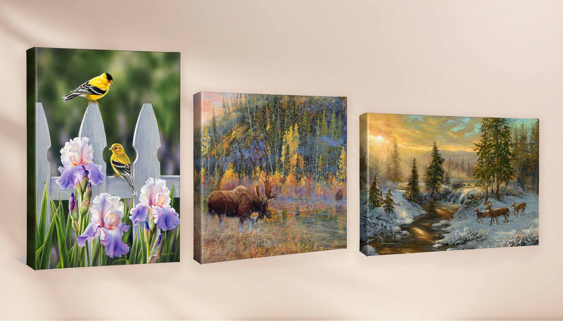 Bring the beauty of nature into your home with this Animals Collection Gallery Wrapped Canvas. Featuring the artwork of Valeria Yost, Janene Grende, and Rosemary Millette. A goldfinch, mCollectionoose, and whitetail deer, each is a stunning piece that captures the elegance and serenity of wildlife in breathtaking detail, making it a perfect addition to any nature-inspired decor.