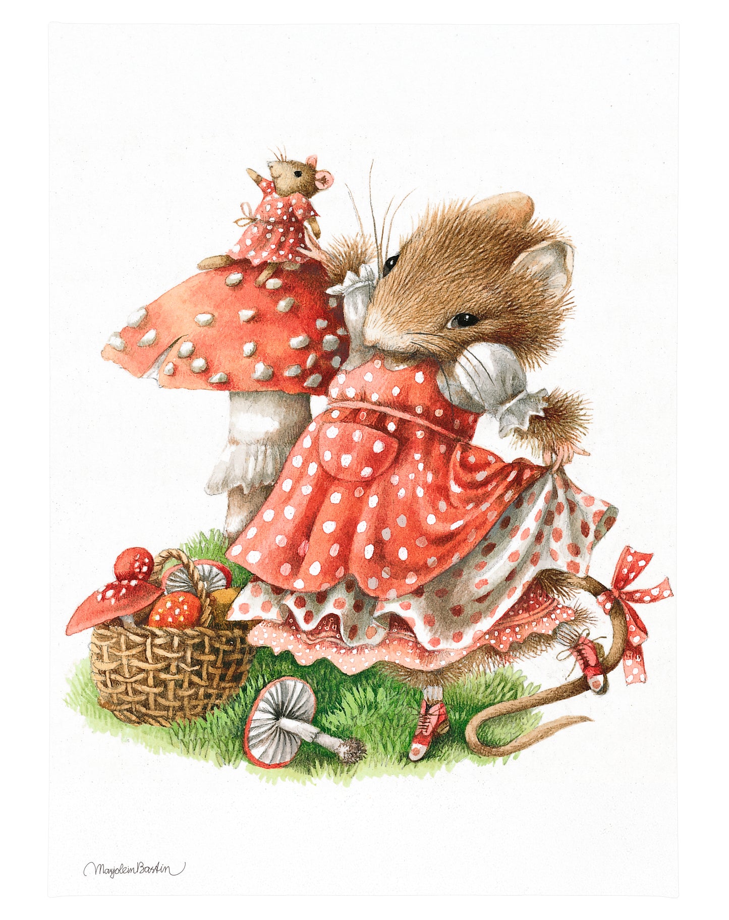 "Dressed in matching red dresses, Vera the Mouse and her beloved Dolly wander through the woodland, gathering mushrooms that perfectly match their outfits. With baskets in hand and eyes full of wonder, they carefully collect nature’s tiny treasures, blending seamlessly with the vibrant reds of the forest. This charming scene captures the magic of autumn, the joy of exploration, and the sweet simplicity of a day spent in nature."