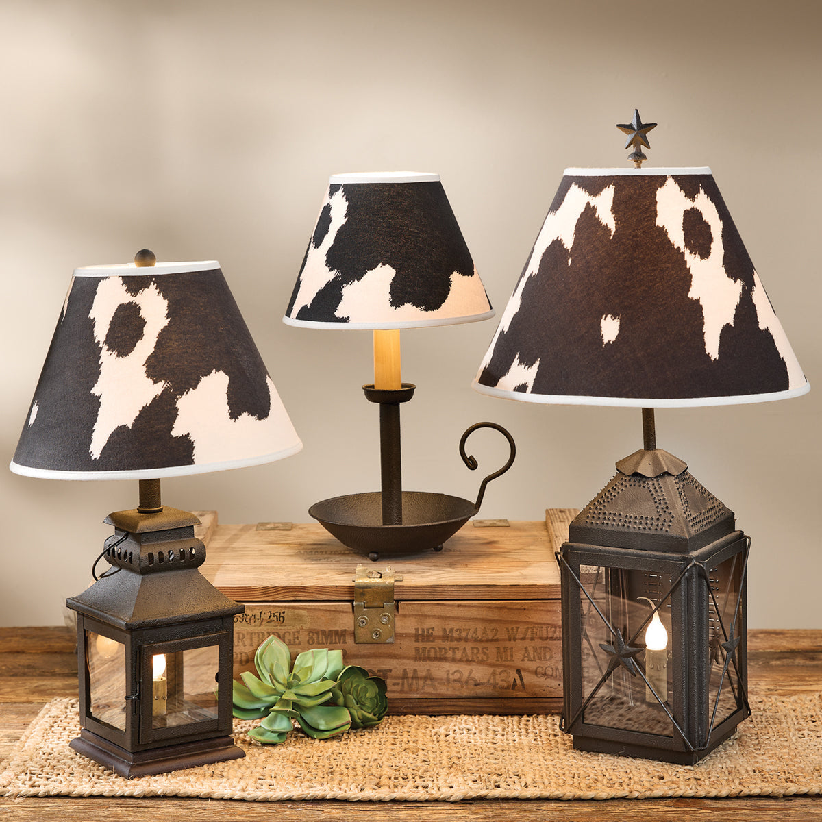 Infuse your space with rustic charm using the Cowhide - Holstein Lampshade. Crafted from 100% cotton fabric over an opaque backing, this lampshade features a bold Holstein cowhide print that adds a touch of countryside elegance to any room. Hand-trimmed and sewn for impeccable quality, it includes a washer fitting designed for use with a harp and finial, ensuring a secure and stylish fit. Measuring 8.5" in height, with a 6" top diameter and a 12" bottom diameter, this lampshade is perfect for enhancing your favorite lamp with a unique and cozy accent.