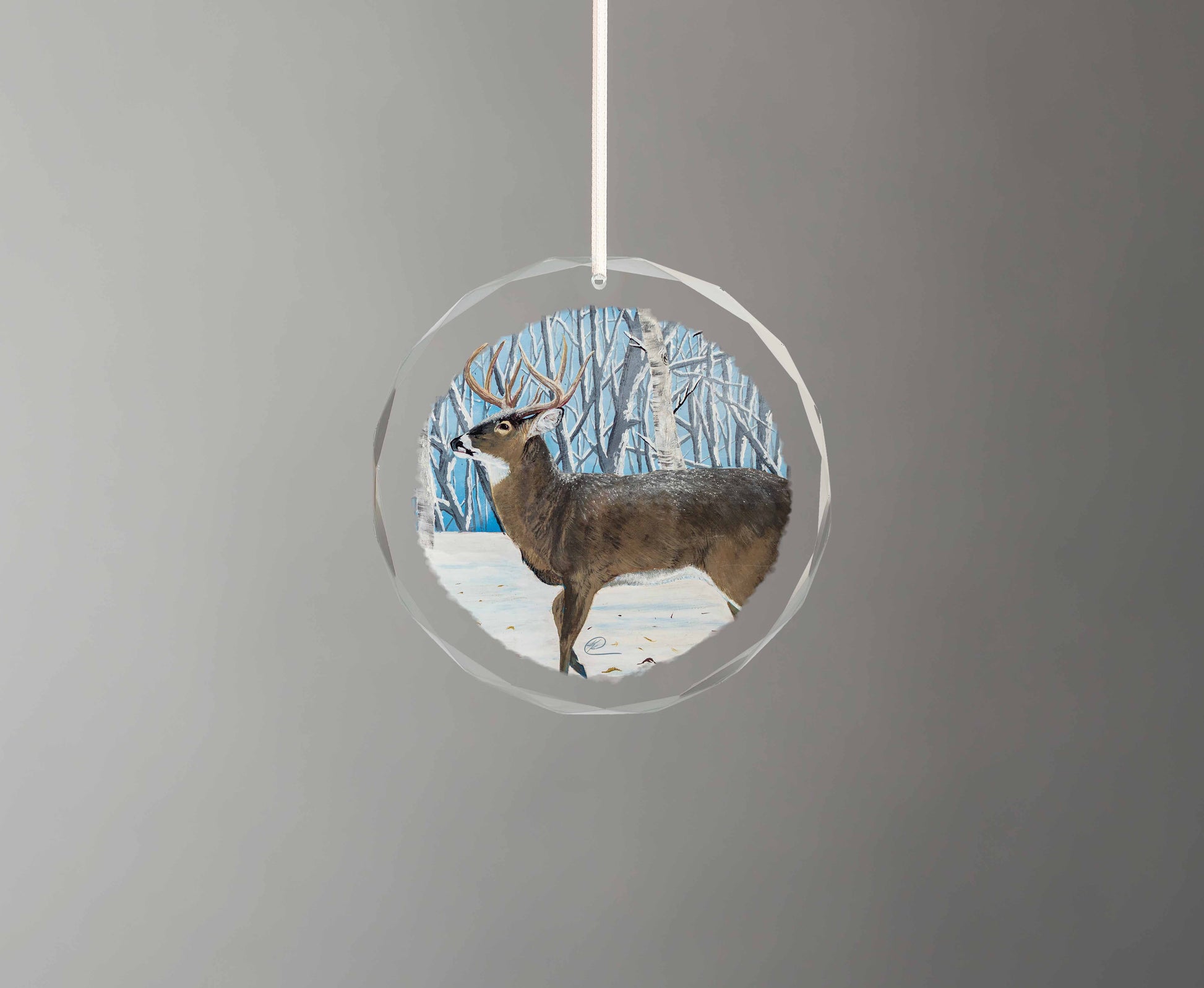 Round, beveled-cut glass ornaments feature images from your favorite Wild Wings artists. Includes 10" silver ribbon for hanging and black velvet bag for storage. Published by Wild Wings ® a division of Art Brand Studios, LLC. Designed and printed in North America.
