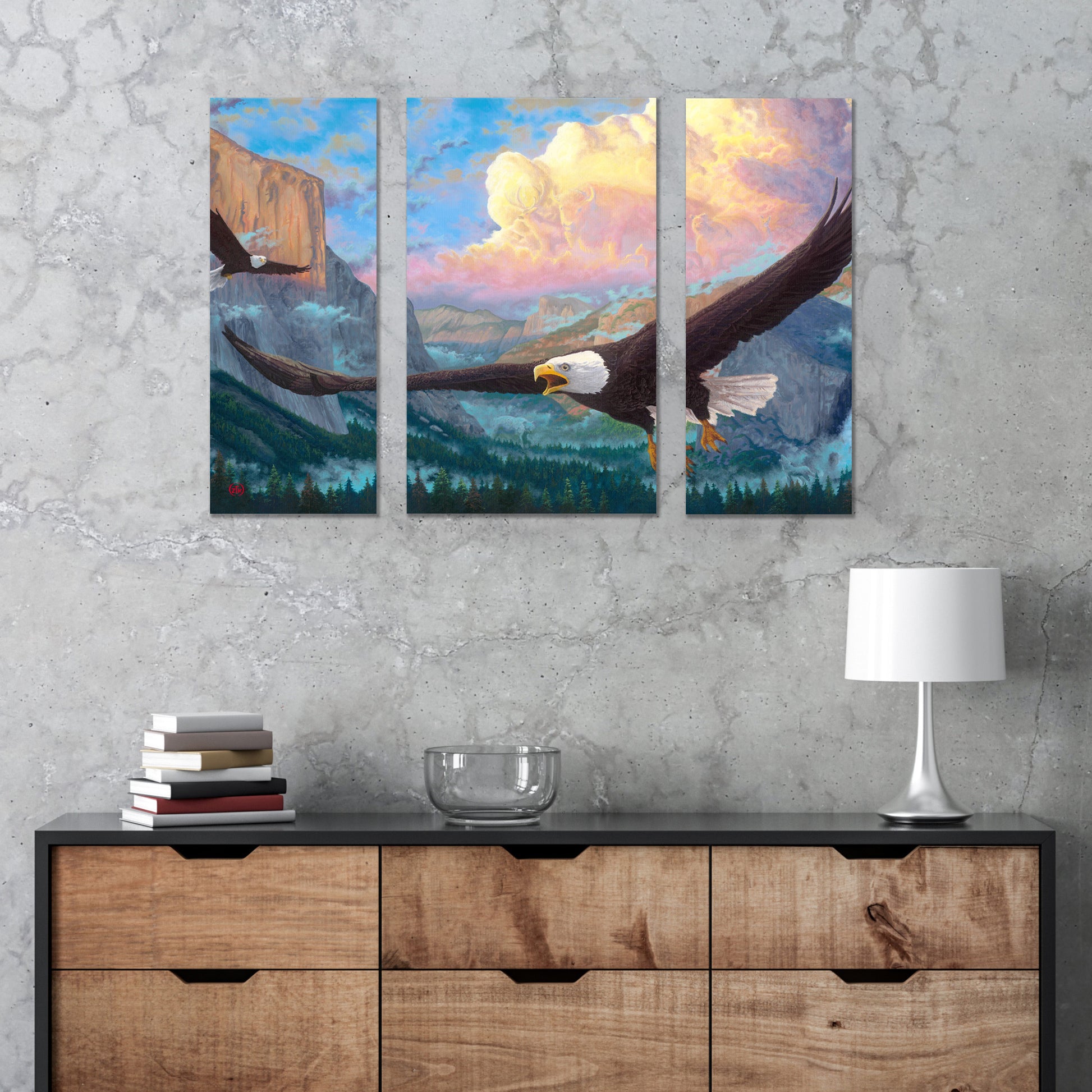 Ansel Adams, Thomas Hill, Albert Bierstadt and my uncle, Thomas Kinkade, are just a few of the artists whose visionary imaginations were captured by the sublime beauty of Yosemite Valley. I, myself, have a long history with this magical place, visiting it on several occasions with my father while on one summer ramble or another. It always struck me as true when Dad would comment that the tunnel view at Artist Point was akin to seeing the face of God" as the perspective opens the valley to the wayward traveler. It is this very backdrop that I am using to finish my first series of paintings on America's Wildlands. The Spirit of Yosemite composition captures the iconic images of El Capitan, Half-Dome and Bridalveil Fall while paying homage to the majestic bald eagles that call the Valley home. In the clouds, see a menagerie of tributes to the other places visited on this particular artistic sojourn. While I hope the depiction of the Valley provides ample evidence of true glory in creation, I also wish that the indomitable nature of the spirit be felt as our majestic national symbol soars. Truly, it is impossible to do work that is comparable in standard to any of the mentioned masters of visual art but I sincerely enjoyed the challenge and want to share with you the outcome. And, as always, let me thank you for sharing my adventure in art."