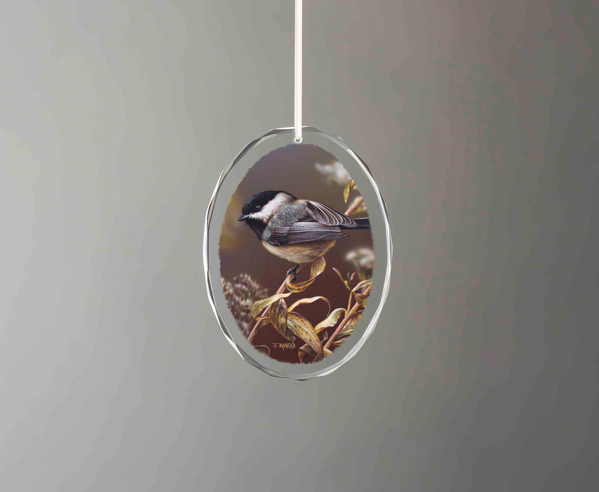 Oval, beveled-cut glass ornaments feature images from your favorite artists. Includes 10" silver ribbon for hanging and black velvet bag for storage. Produced by Wild Wings; a division of Art Brand Studios. Designed and printed in North America. 3-1/2"H x 3"W