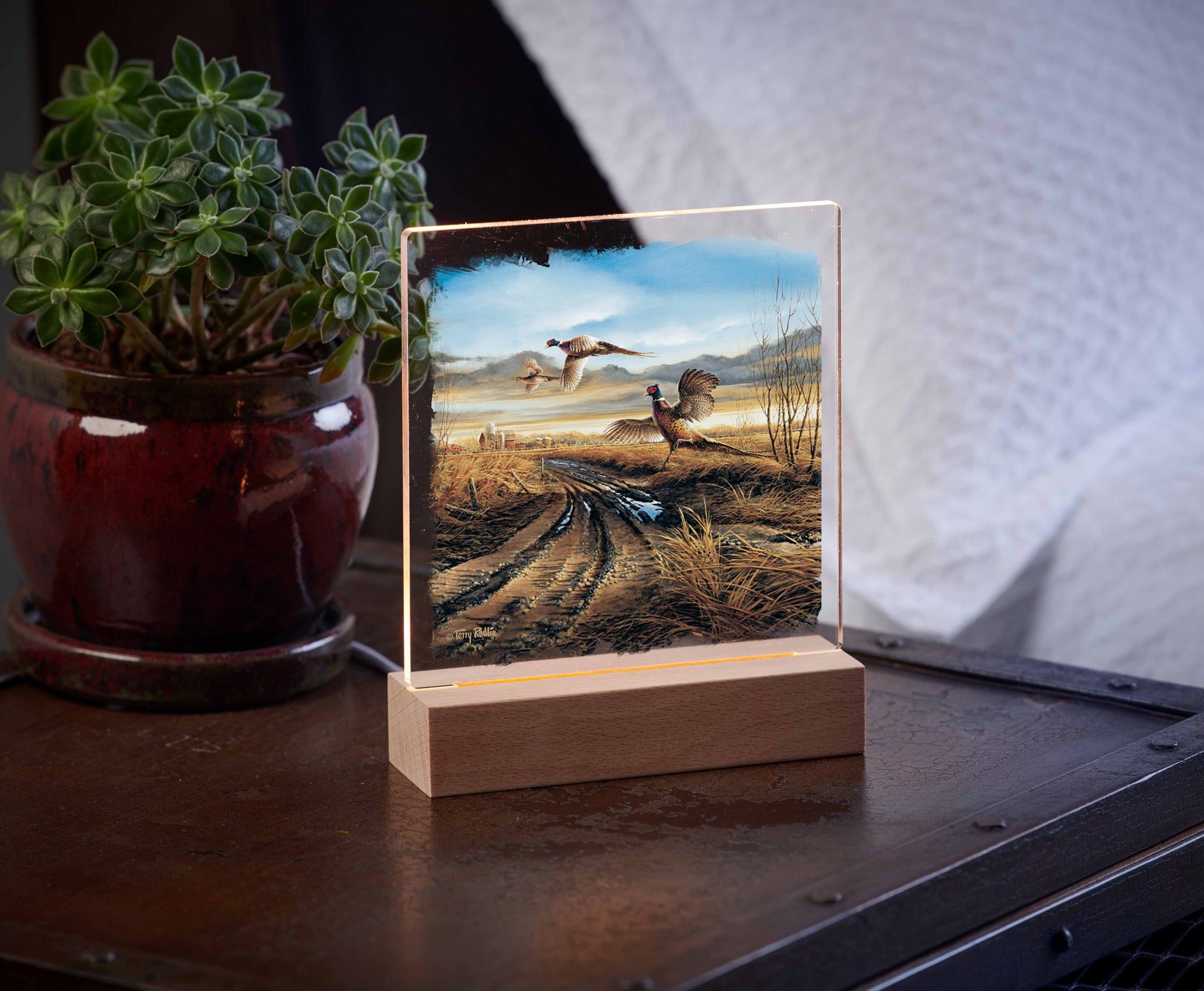 A soft ambient light with a favorite image leaves a sense of calm amid the darkness of night and beauty by daylight. A wood base with acrylic panel is illuminated by a 3-watt warm LED light. USB plug-in with button switch. USB adaptor and microfiber cleaning cloth are included. Components are UL listed. Artwork by Krystin Kaess. Published by Wild Wings; a division of Art Brand Studios, LLC. Designed and printed in the USA.