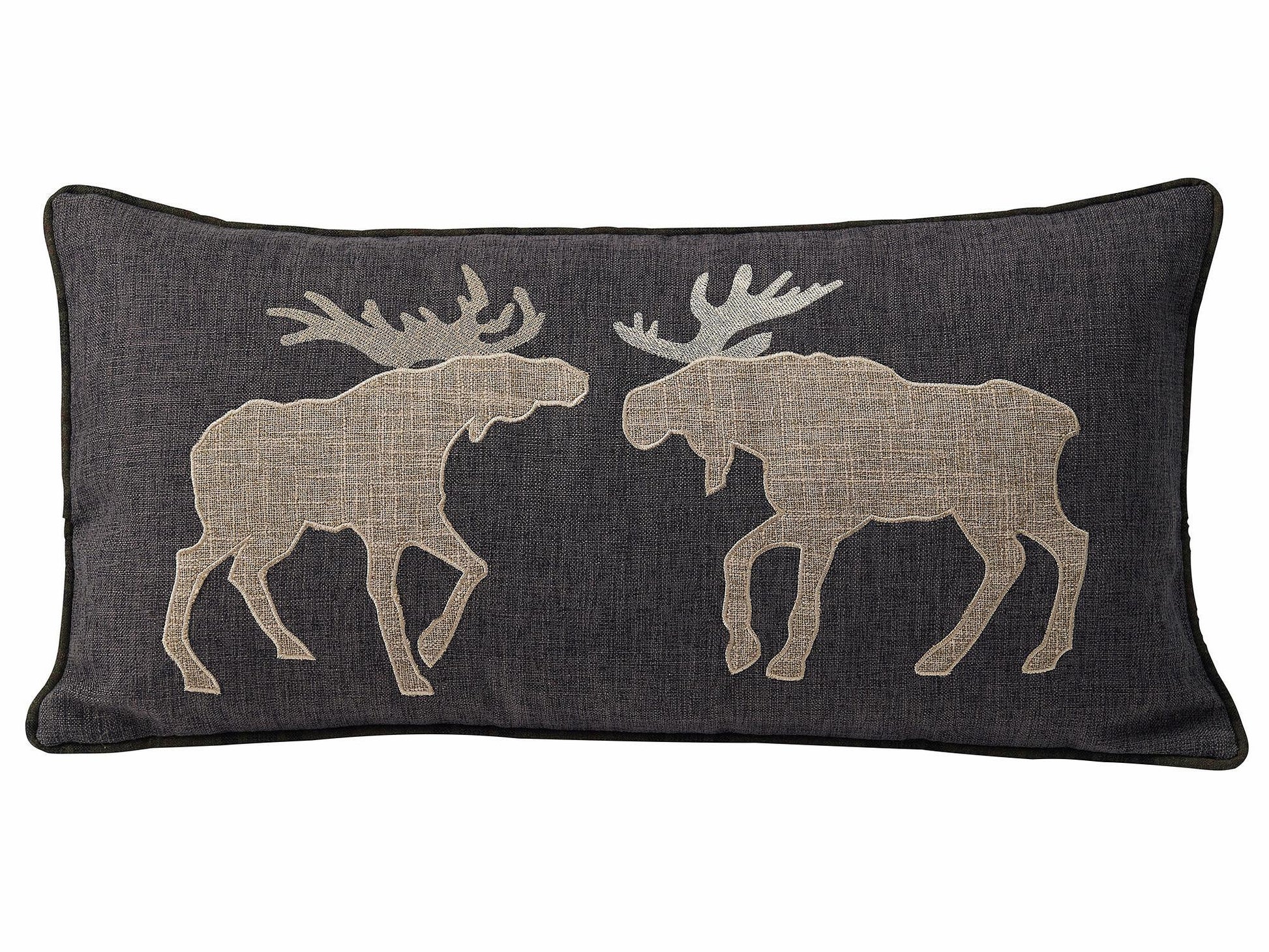 A stylish decorative pillow with two moose, perfect for a bedroom or living room. 14"H x 26"W