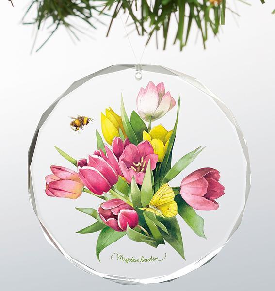 Round, beveled-cut glass ornaments featuring the art of Marjolein Bastin. Includes 10" silver ribbon for hanging and black velvet bag for storage. Made exclusively by Wild Wings. 3" dia.