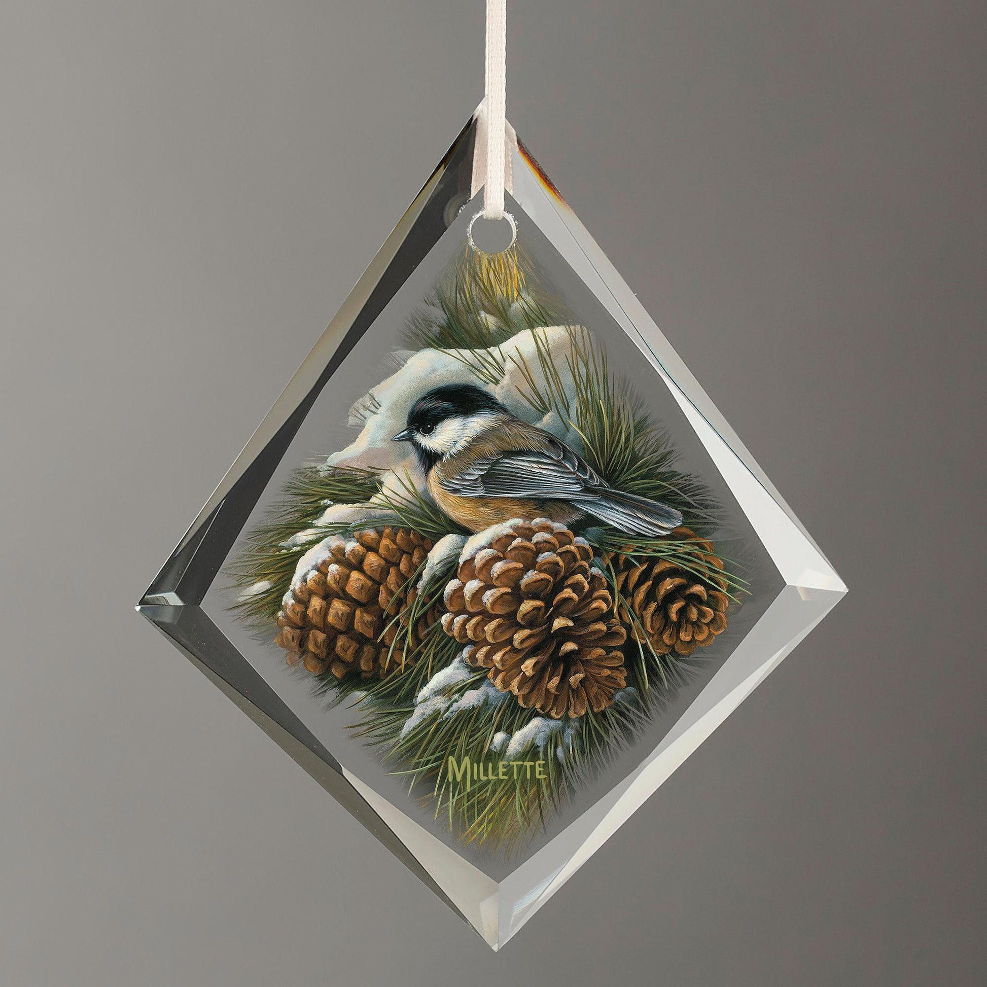 Tear drop, beveled-cut glass ornaments feature images from your favorite Wild Wings artists. Includes 10" silver ribbon for hanging and black velvet bag for storage. Produced by Wild Wings; a division of Art Brand Studios. Designed and printed in North America. 4"H x 3"W