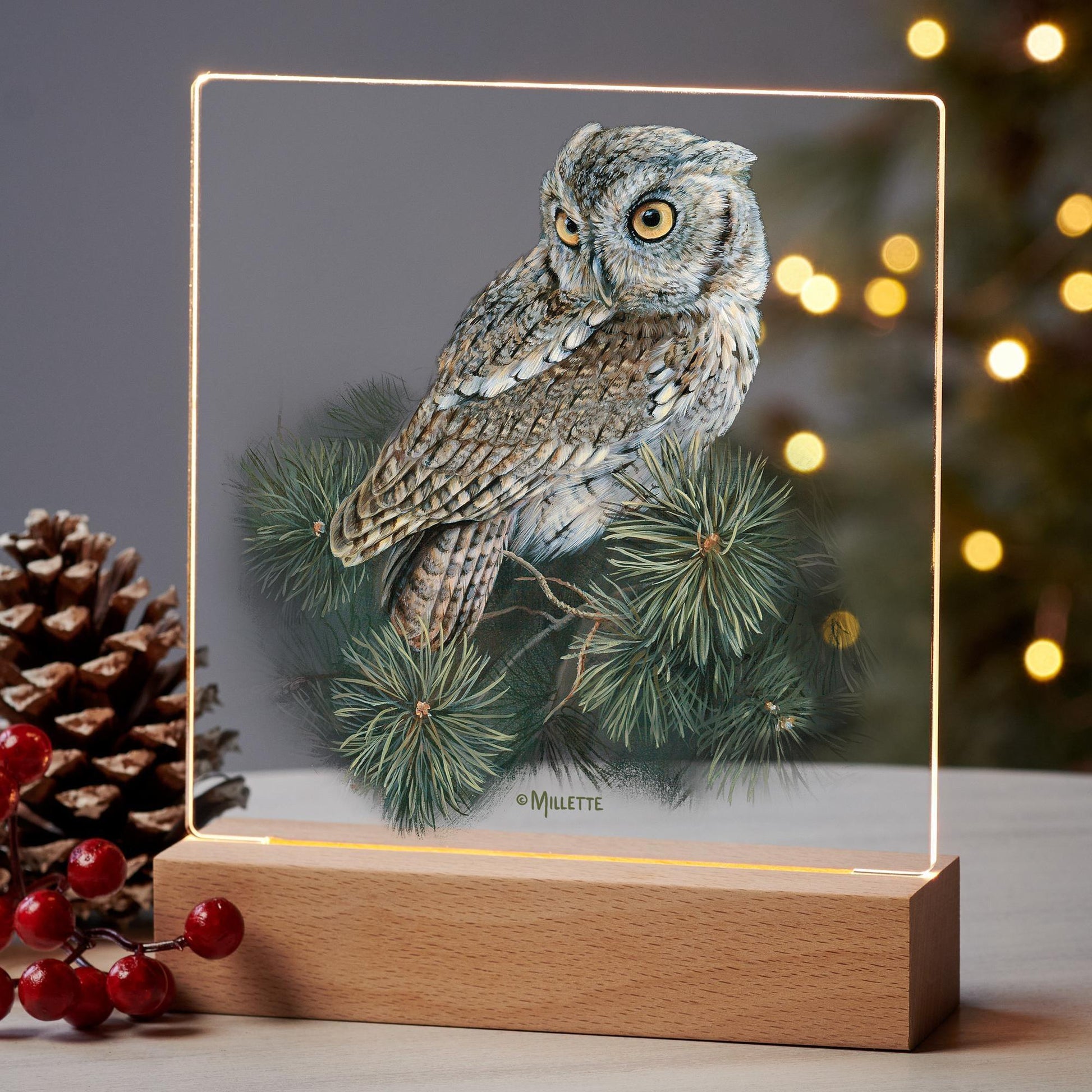 A soft ambient light with a favorite image leaves a sense of calm amid the darkness of night and beauty by daylight. A wood base with acrylic panel is illuminated by a 3-watt warm LED light. USB plug-in with button switch. USB adaptor and microfiber cleaning cloth are included. Components are UL listed. Artwork by Rosemary Millette. Published by Wild Wings; a division of Art Brand Studios, LLC. Designed and printed in the North America.