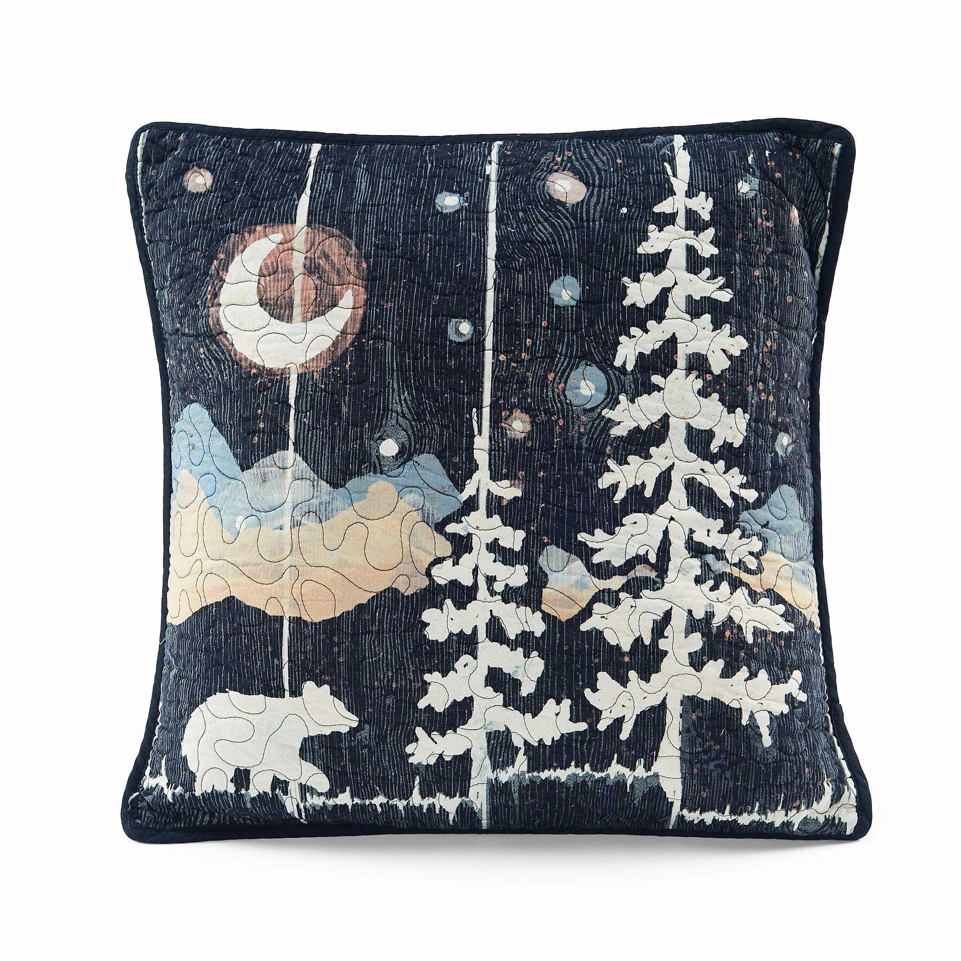 A hush falls over the night as a bear peacefully strolls under the moonlight. A deep charcoal wood-grain texture sets the backdrop for a quiet wooded landscape scene in charcoal, ivory, sand, gray, and rust. 100% cotton. All pieces sold separately. Machine wash. Imported. Decorative Pillow 18" x 18"
