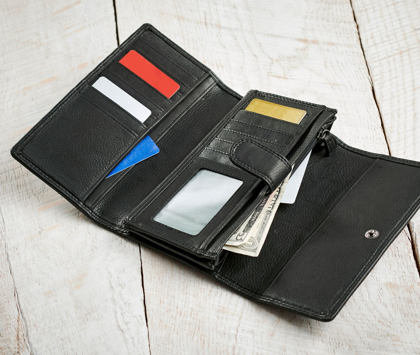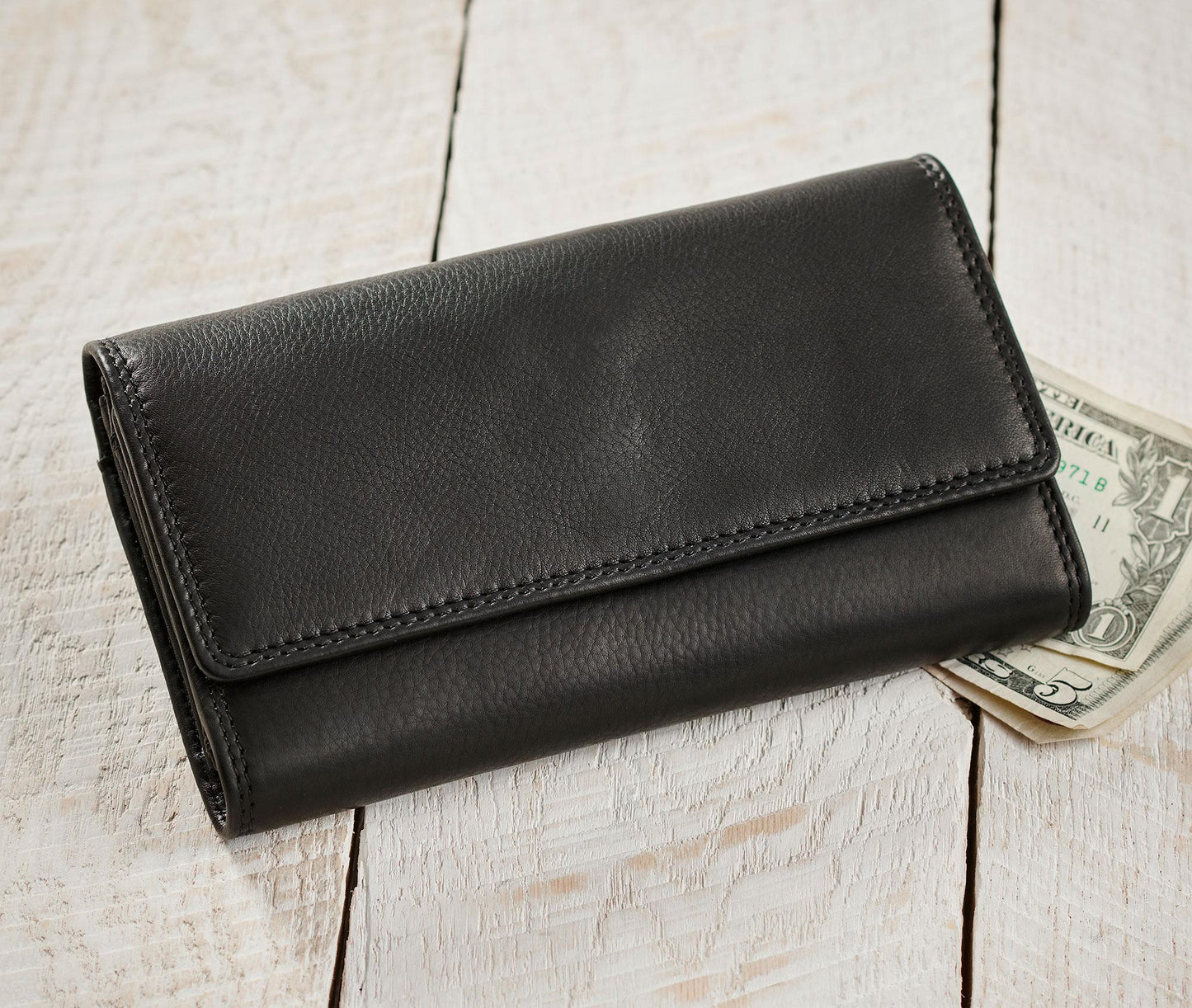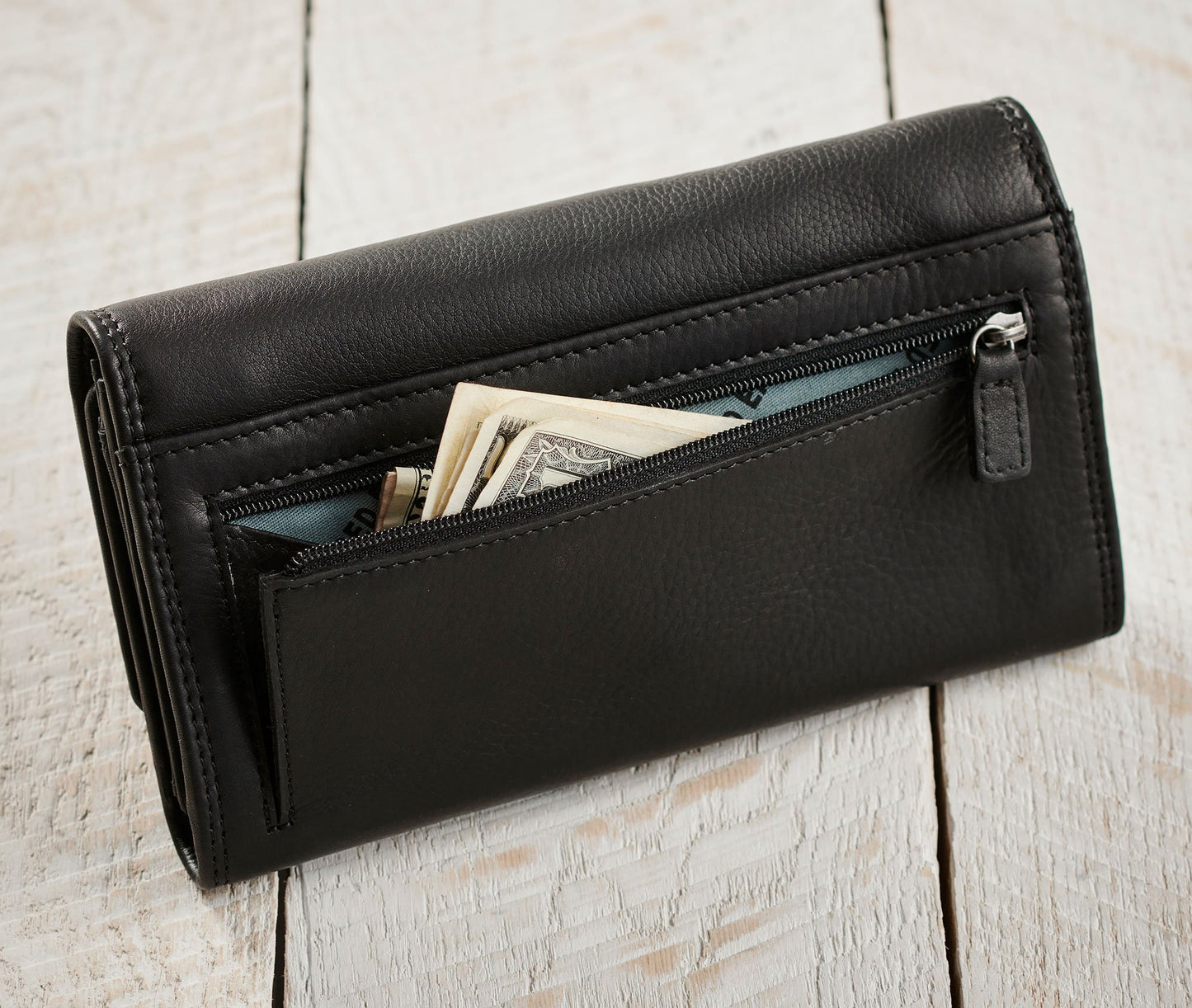 Coordinating wallet is not shy on pockets boasting 14 credit card slots, one ID slot, plus hidden pouches behind credit card slots for additional storage, two slots for bills and receipts with a zippered pocket in between. Zipper on back with easy open gusset. Crafted of genuine cowhide, each piece is unique as the leather has been naturally tanned allowing the natural oils and beauty of the leather to come through. 4"H x 7½"W x 1"D