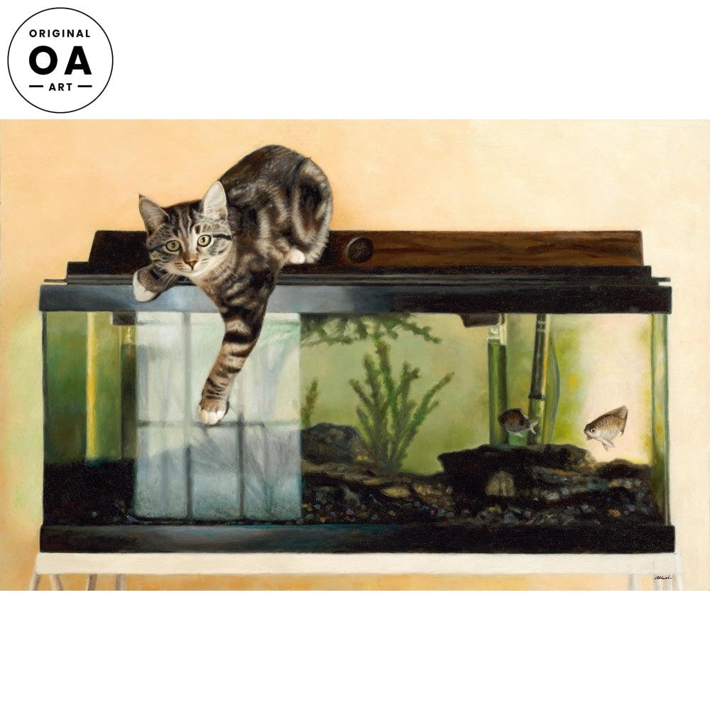 Original oil painting of a cat and fish tank by John Aldrich. Image size, 19-3/4"H x 30"W.