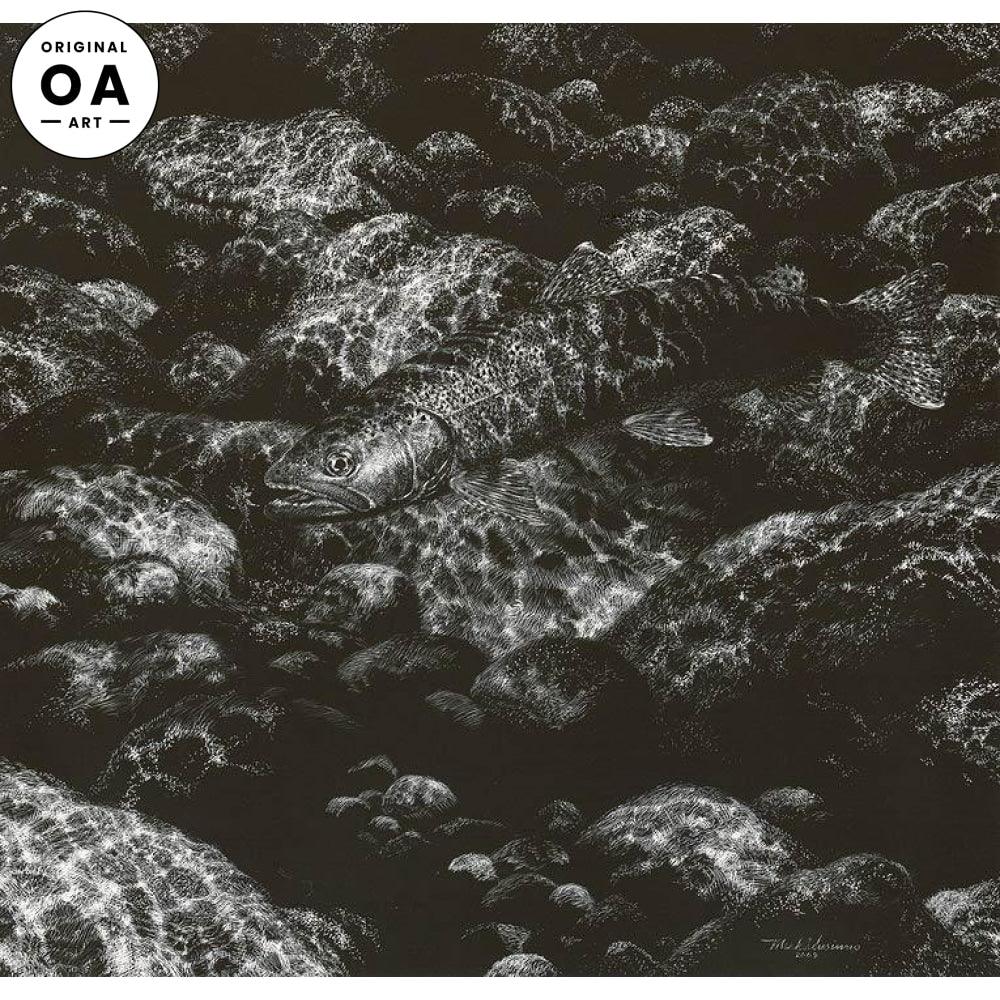 Original scratchboard depicting a rainbow trout taking a nymph from the rocks. Image size, 11" x 11". Framed size 20-1/2" x 20-1/2"