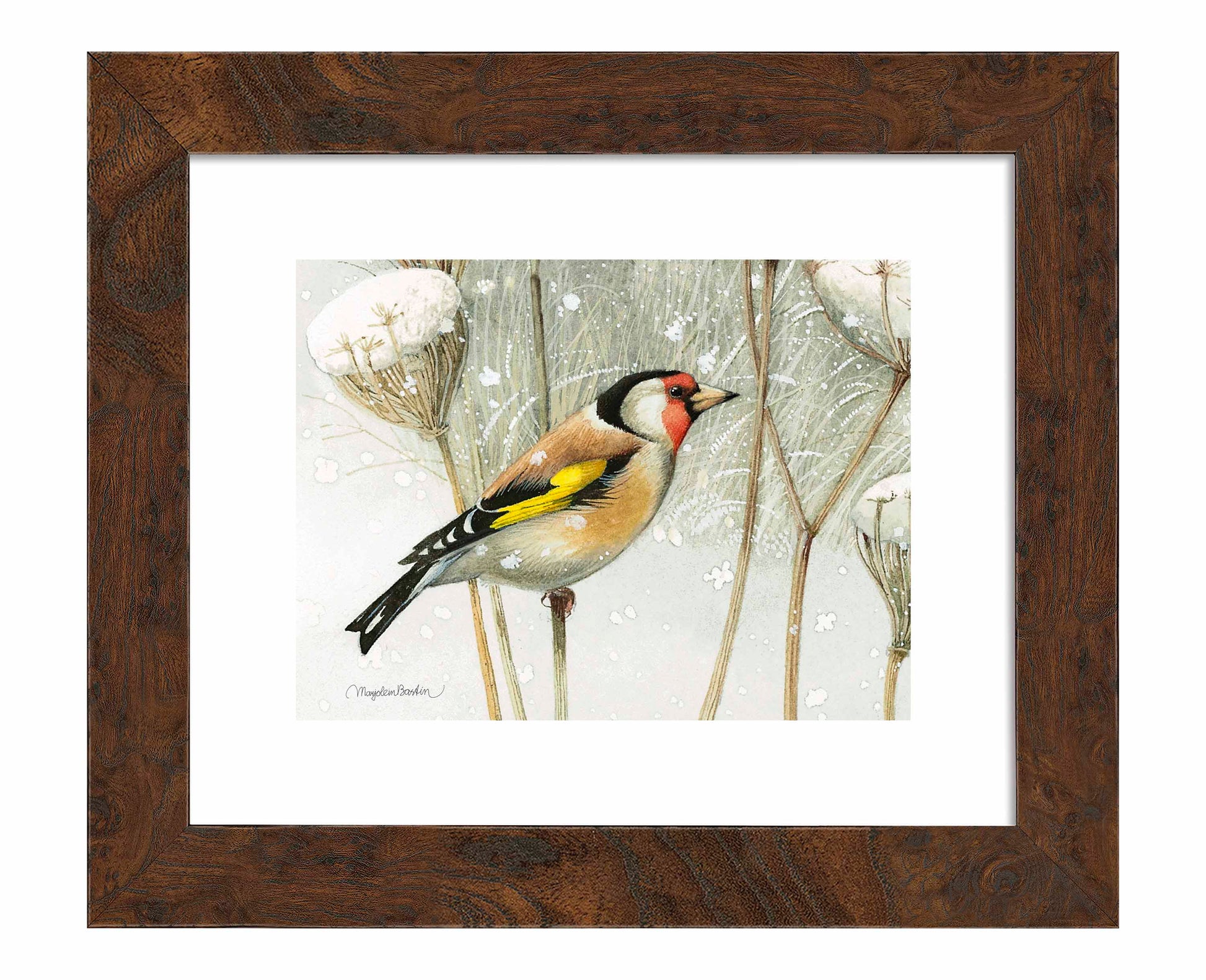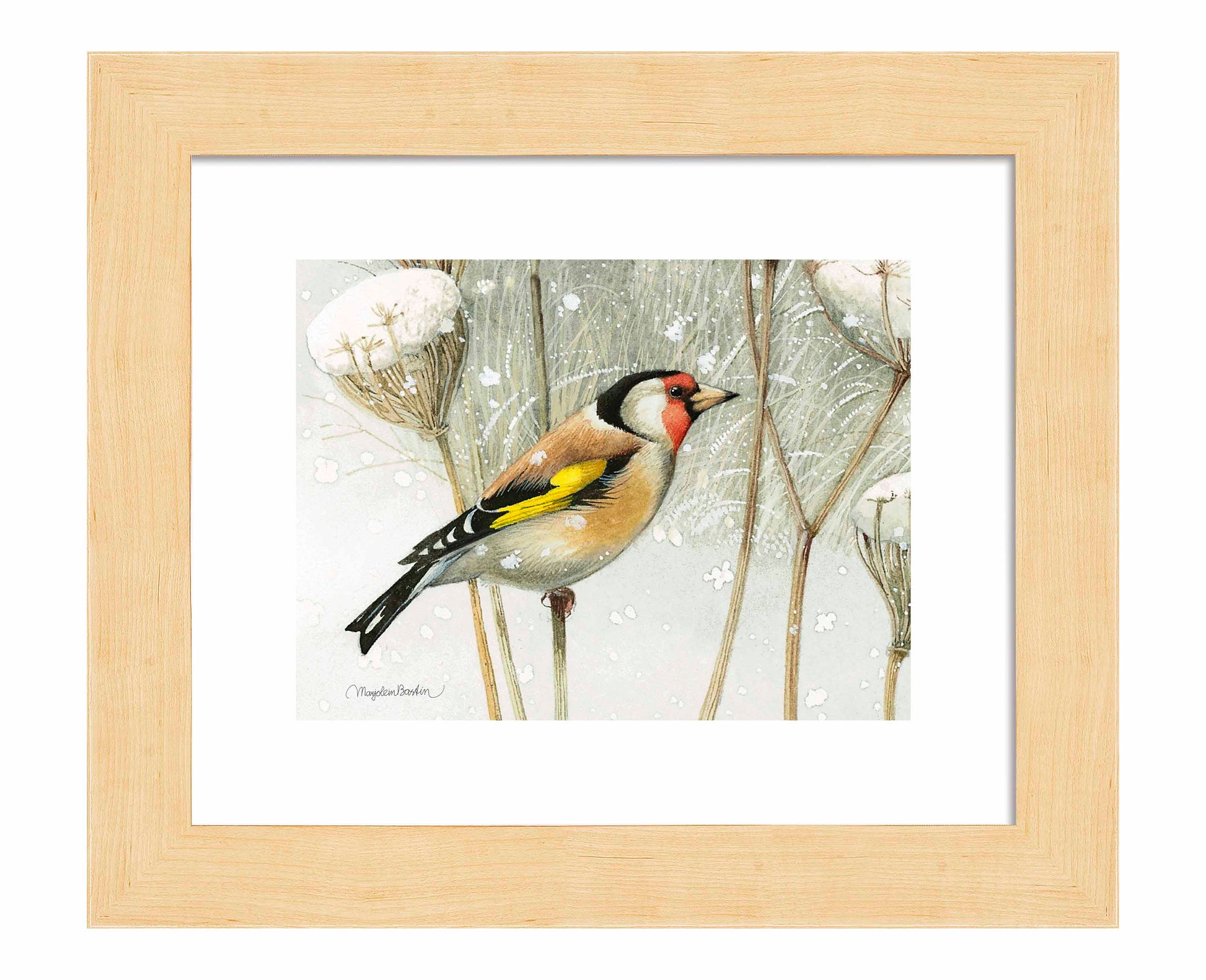 A beautiful calm winter day, the snow has been coming down steadily for hours now and I’ve been admiring the white blanket we have been given. Then suddenly a European goldfinch alights on a branch – and suddenly my brushes awake and I have the urge to paint! Just look at those colors, especially when everything else is so quiet and restrained.