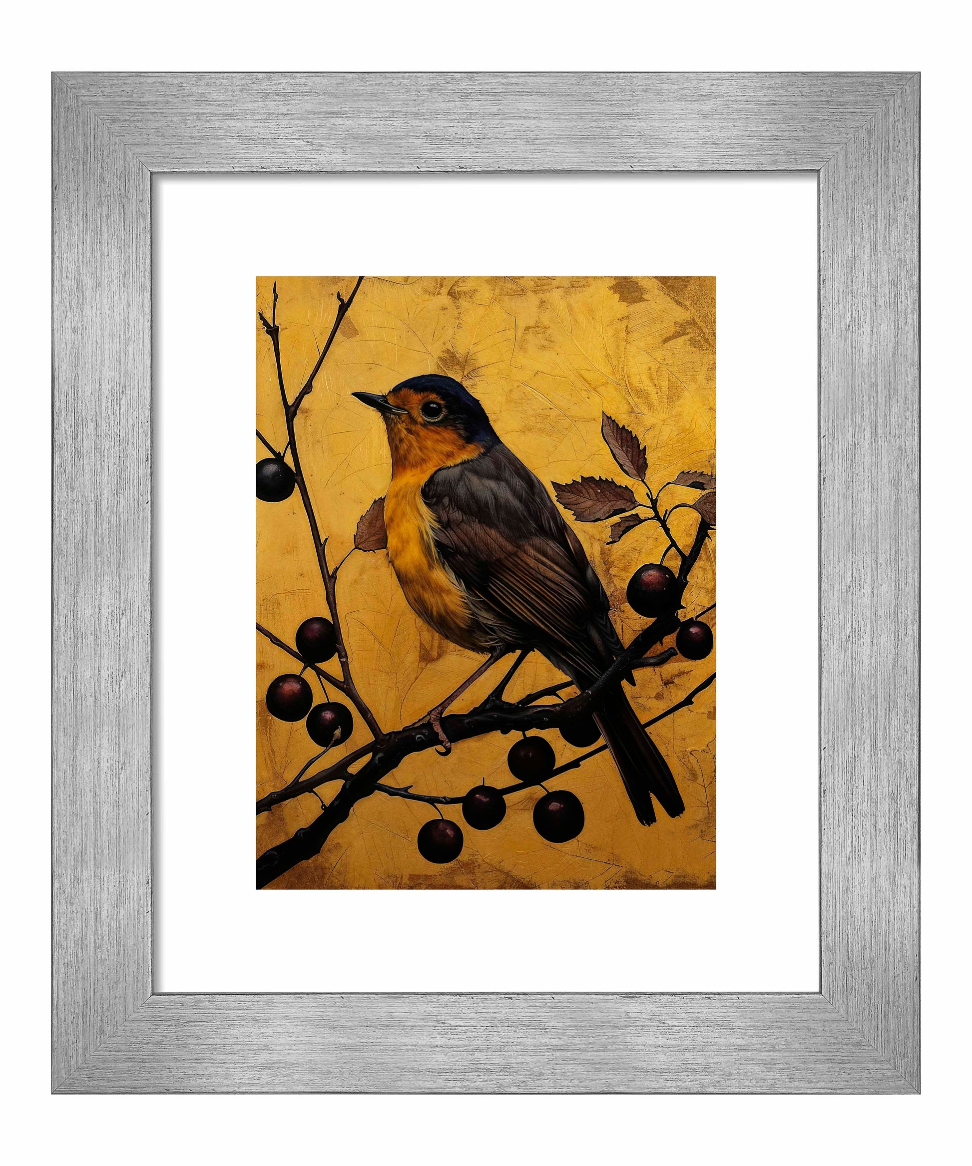 Autumn's Elegance - Robin Among Berries blends the warmth of autumn with the serene beauty of a robin perched amidst a branch of dark berries. The painting showcases a robin with vibrant, golden-yellow plumage contrasted by its rich, dark brown feathers. The intricate detailing of the bird's feathers and the branch it rests upon is a testament to the artist's meticulous craftsmanship.The background, painted in a deep, golden hue, enhances the robin's colors, creating a striking contrast that draws the viewer's eye to the center of the composition.The interplay of light and shadow gives the scene a lifelike quality, capturing a moment of quiet beauty and natural harmony.