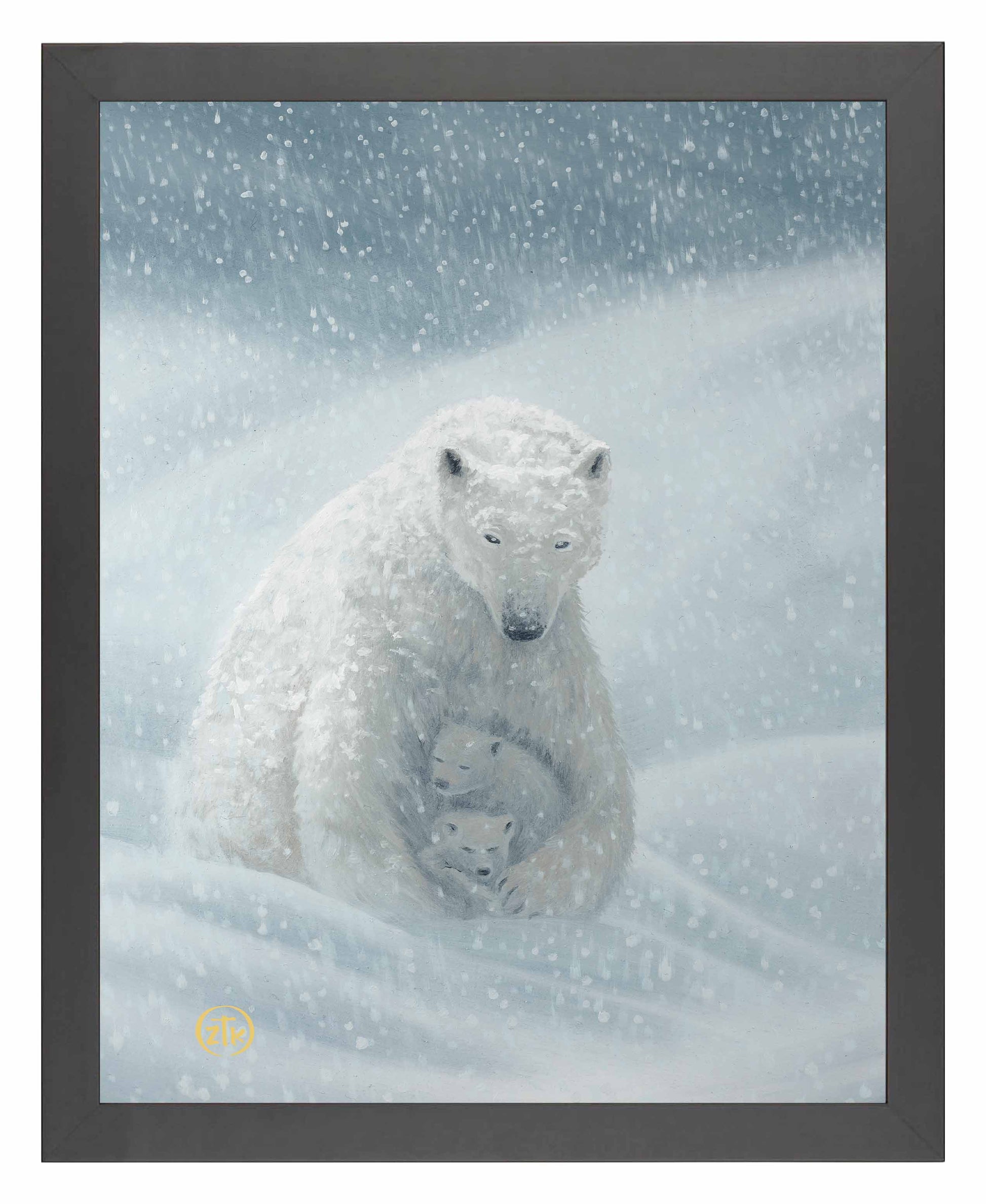 In this addition to my Animal Accent series, I attempt to capture the essence of a maternal bond. A Mother’s Warmth tells the story of a family of polar bears making their way in an unforgiving landscape. Like its human counterparts, the mama bear gives comfort to her children. In the case of this family, it is a physical warmth provided, but the protection of a parent can take many forms. My hope for this work is that it provides us all some reminder of what was given to us though the love of our own mothers. As always, I want to thank you for sharing my adventures in art. I love you, Mom.