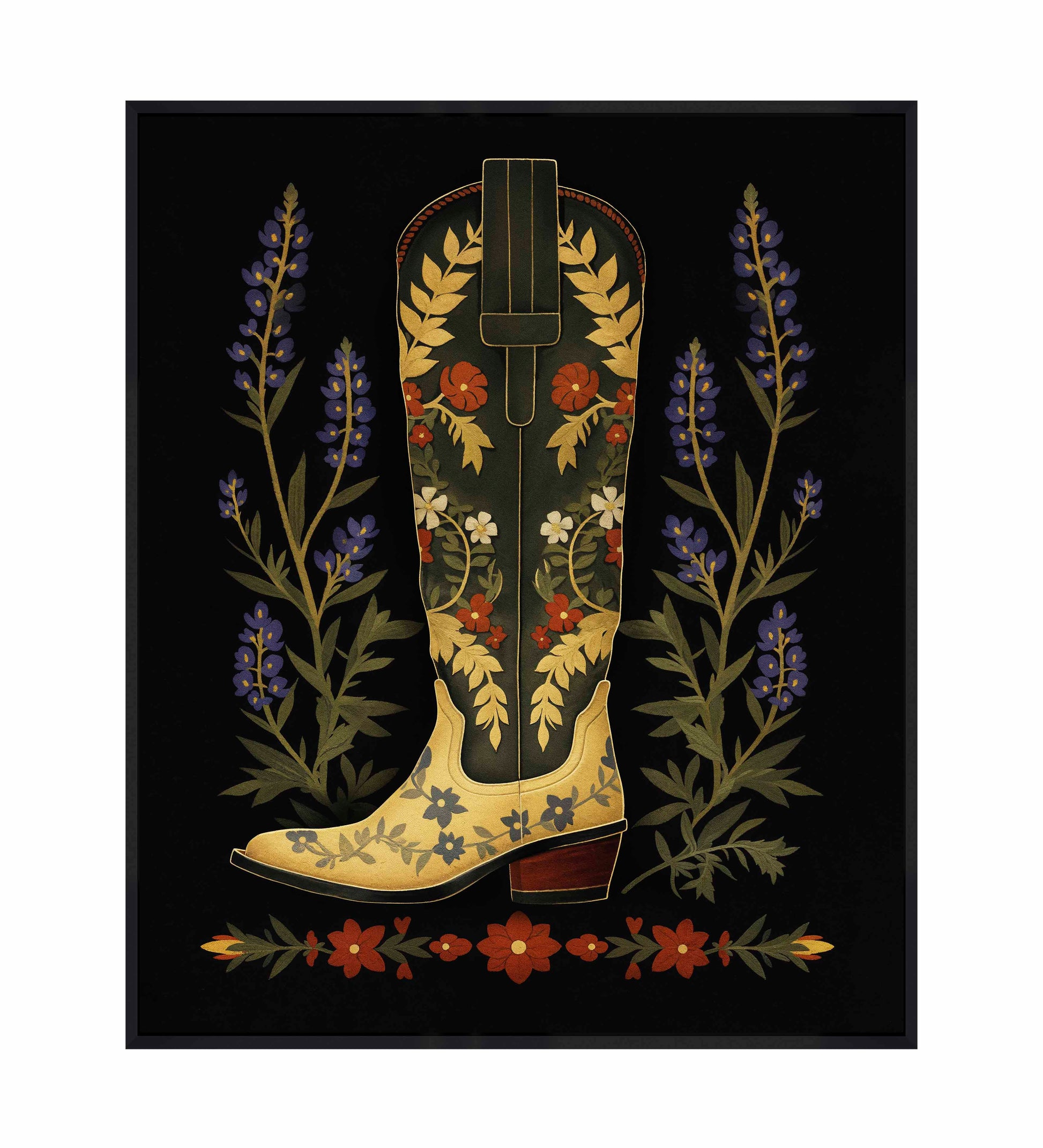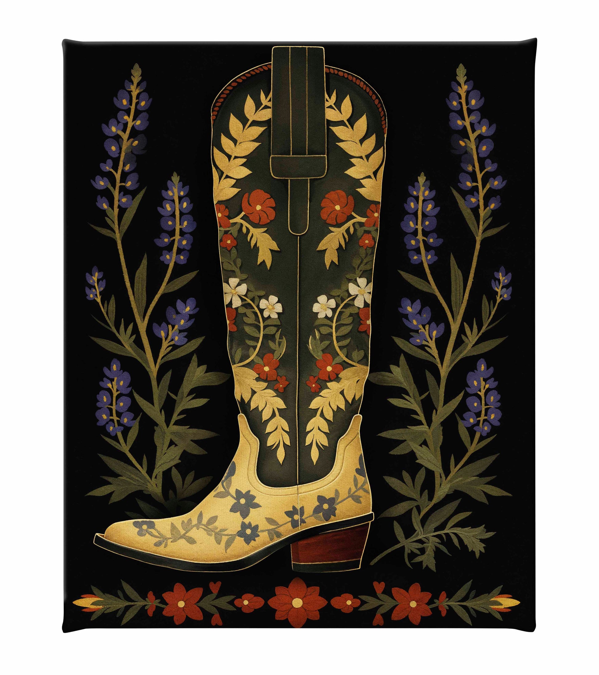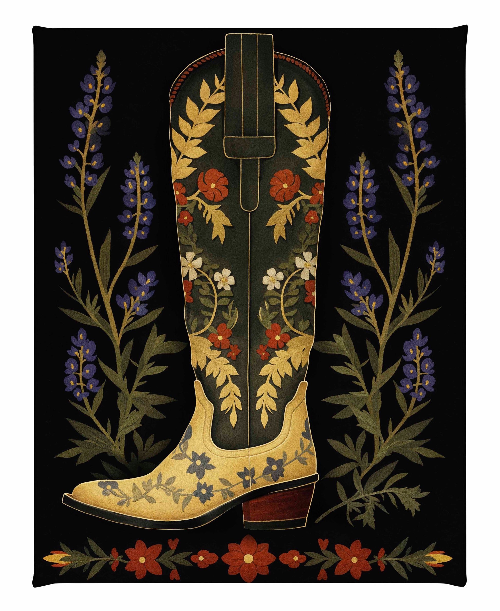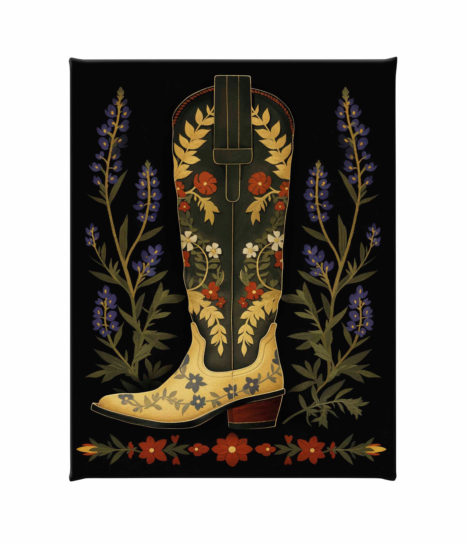 On either side of the boot, tall stalks of bluebonnets frame the central figure, adding a touch of nature’s charm and further enhancing the painting’s theme of Western flora. Below the boot, a series of red and green floral elements form a horizontal border, grounding the composition and adding symmetry to the overall design. The dark background serves to amplify the colors and intricate details of the boot and flowers, making them the focal points of the piece.About the Product