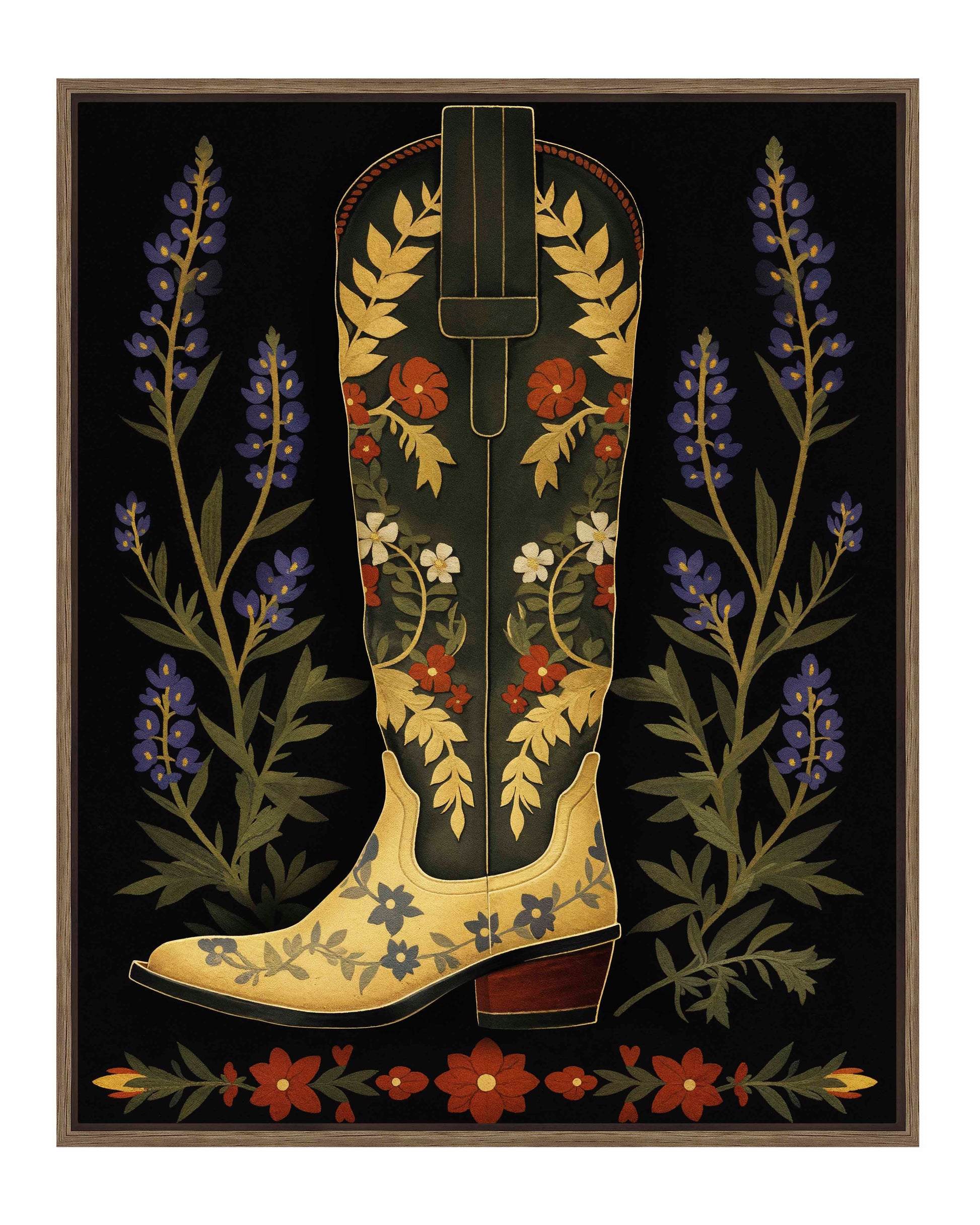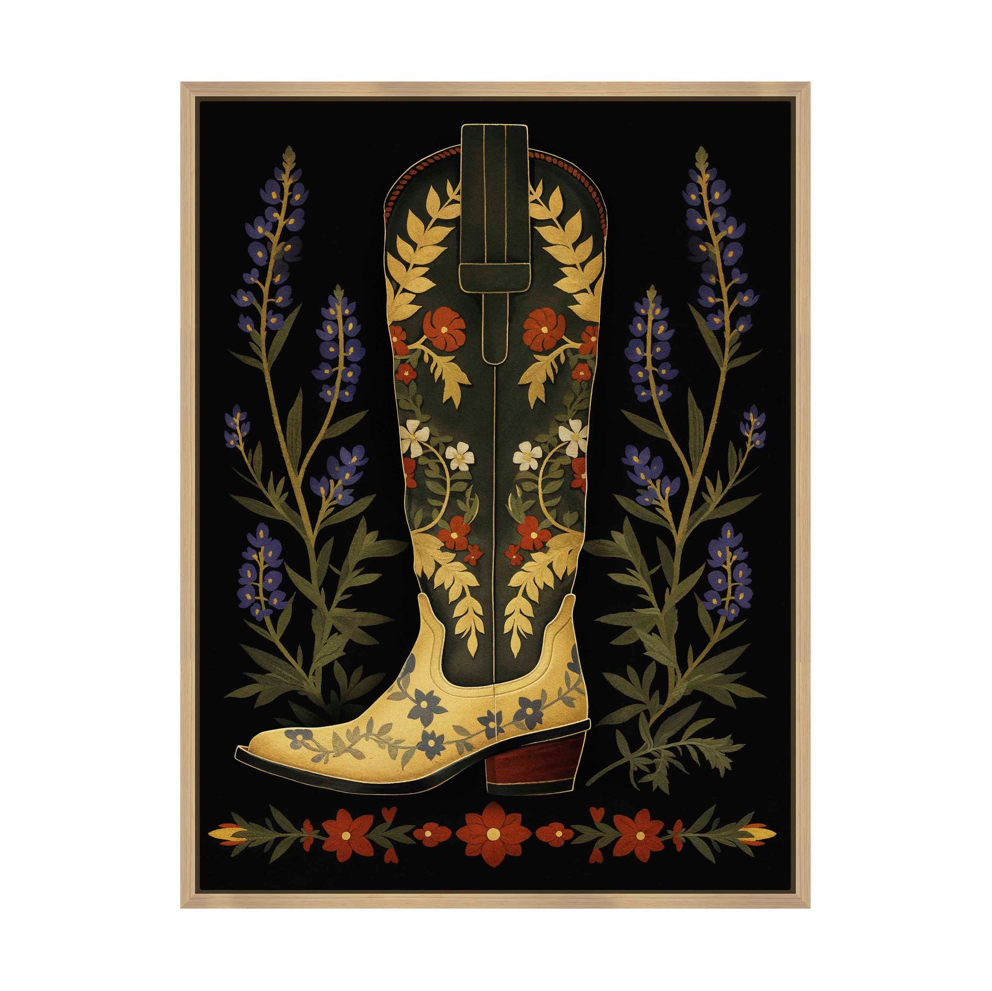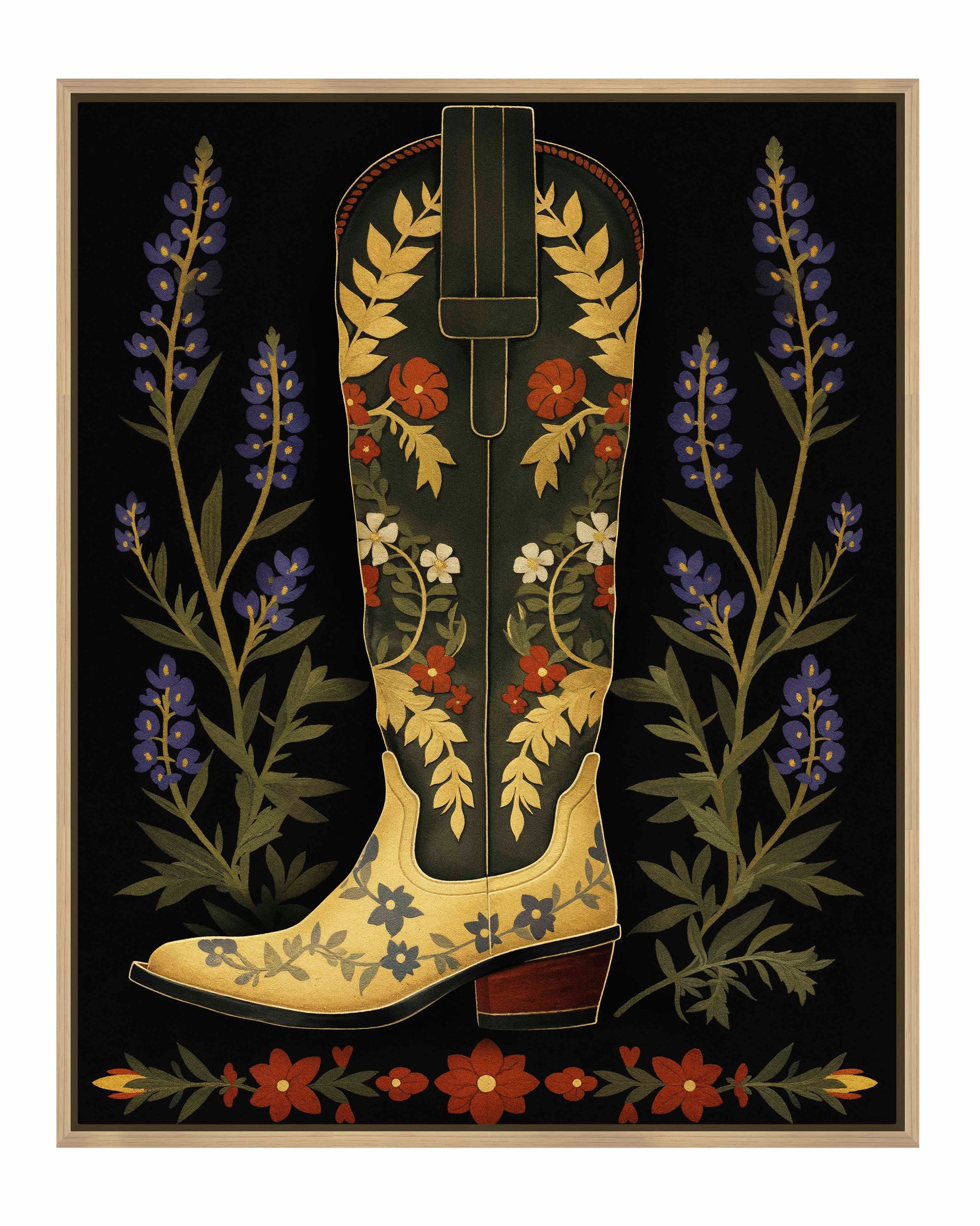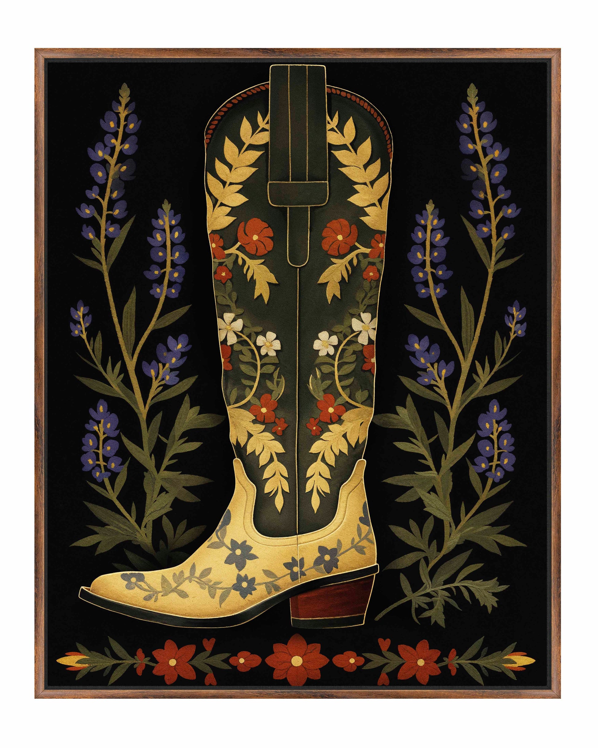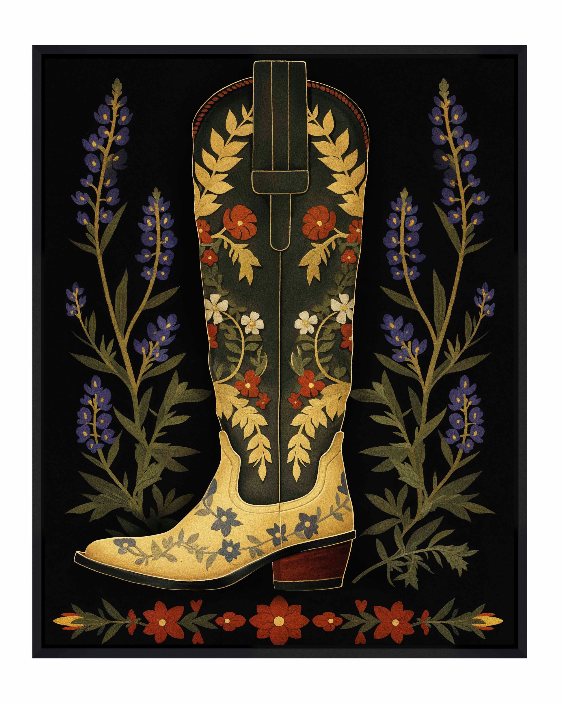 On either side of the boot, tall stalks of bluebonnets frame the central figure, adding a touch of nature’s charm and further enhancing the painting’s theme of Western flora. Below the boot, a series of red and green floral elements form a horizontal border, grounding the composition and adding symmetry to the overall design. The dark background serves to amplify the colors and intricate details of the boot and flowers, making them the focal points of the piece.About the Product