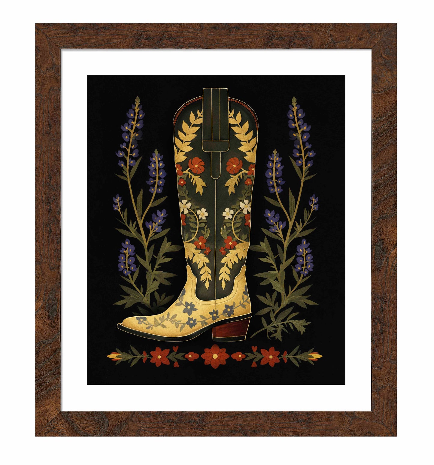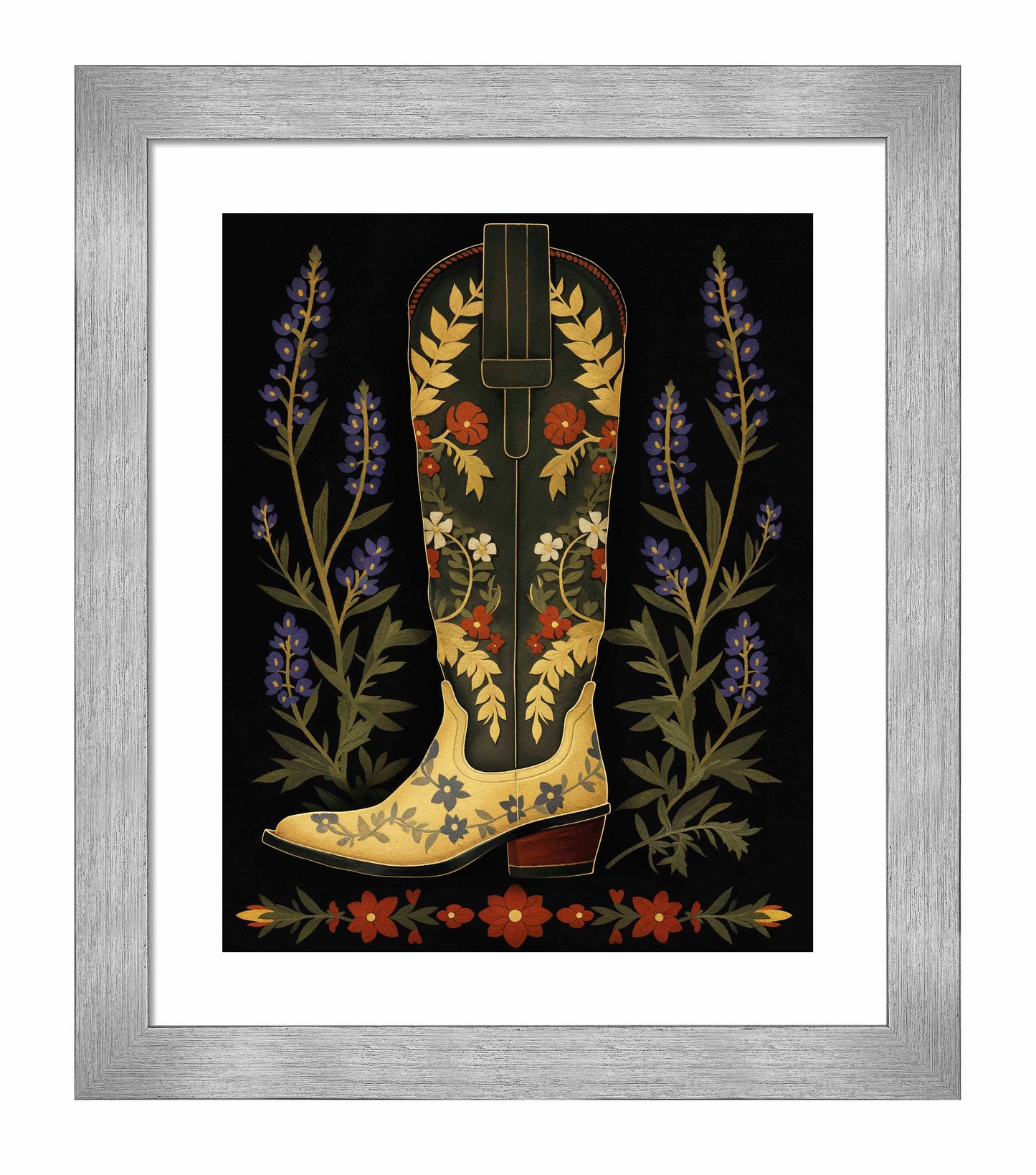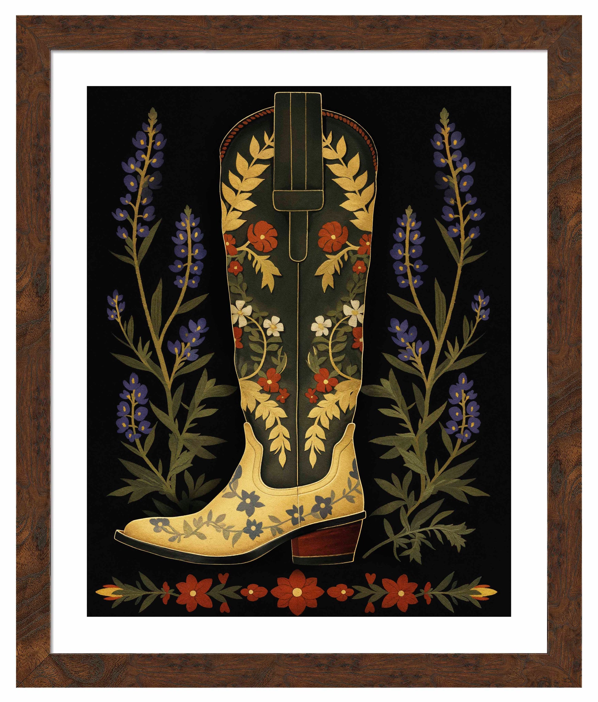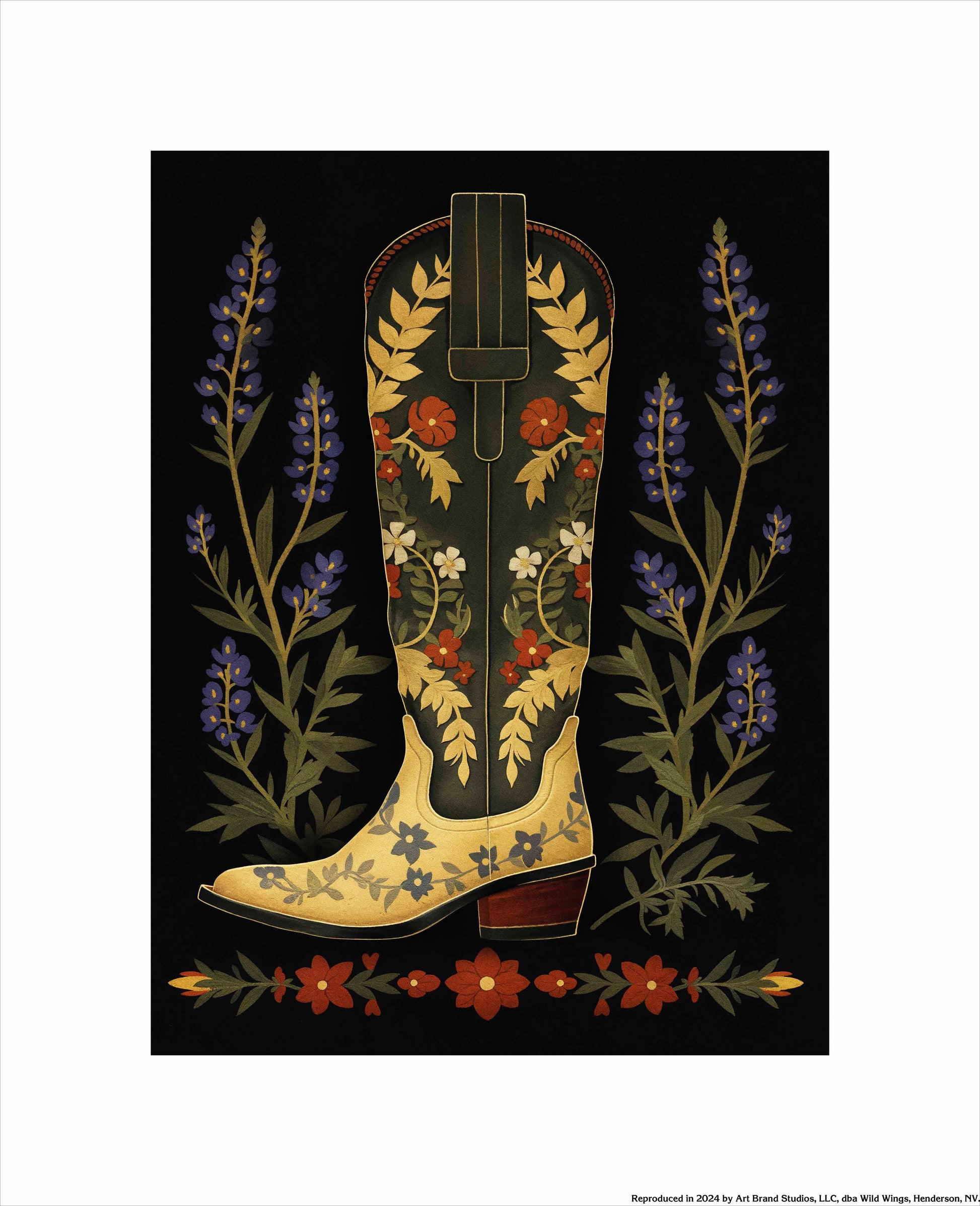 On either side of the boot, tall stalks of bluebonnets frame the central figure, adding a touch of nature’s charm and further enhancing the painting’s theme of Western flora. Below the boot, a series of red and green floral elements form a horizontal border, grounding the composition and adding symmetry to the overall design. The dark background serves to amplify the colors and intricate details of the boot and flowers, making them the focal points of the piece.